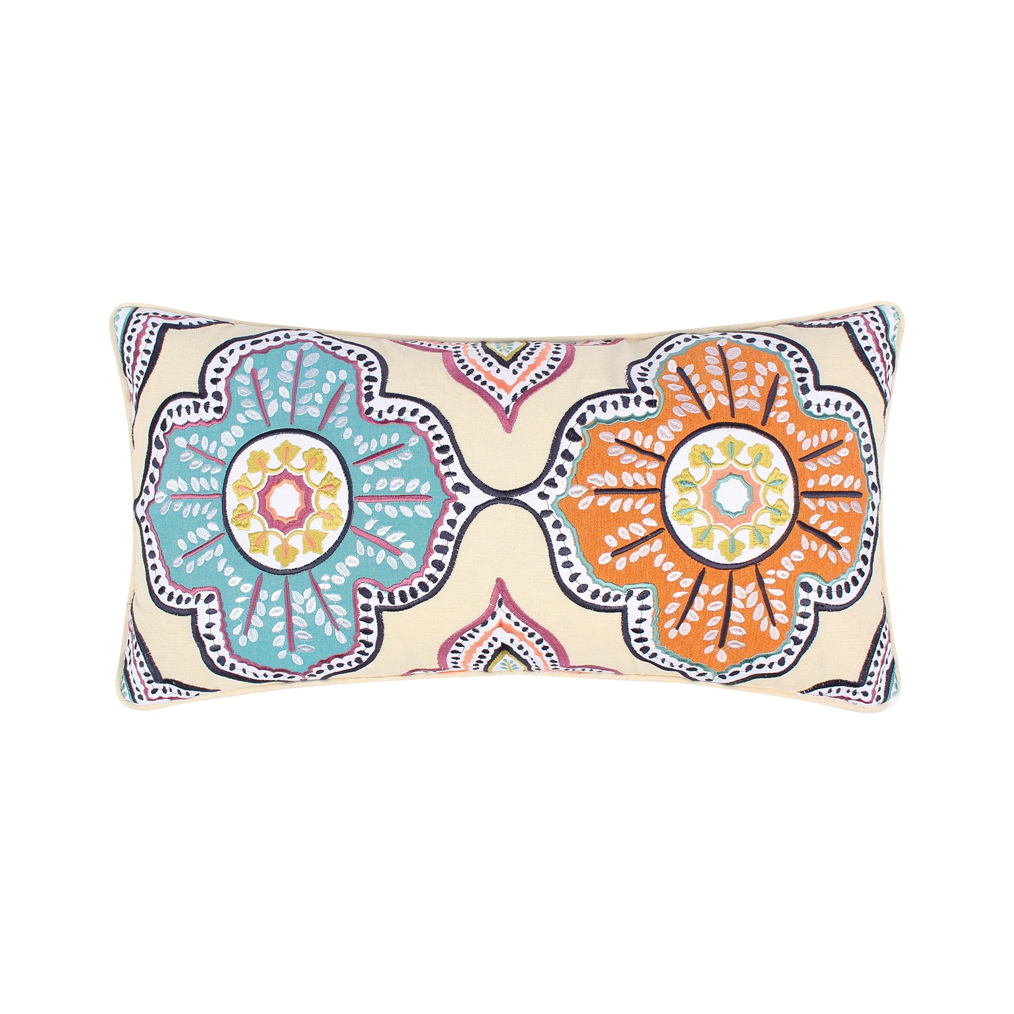 Levtex Home – Magnolia Navy- Decorative Pillow (12×24 in.) – Medallion Embroidered, Applique in Multicolor- Tan, Teal, Orange, and Navy