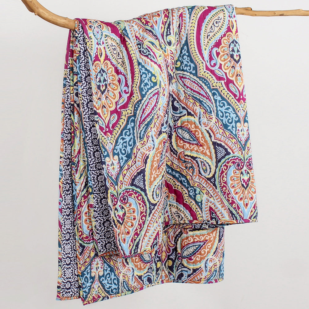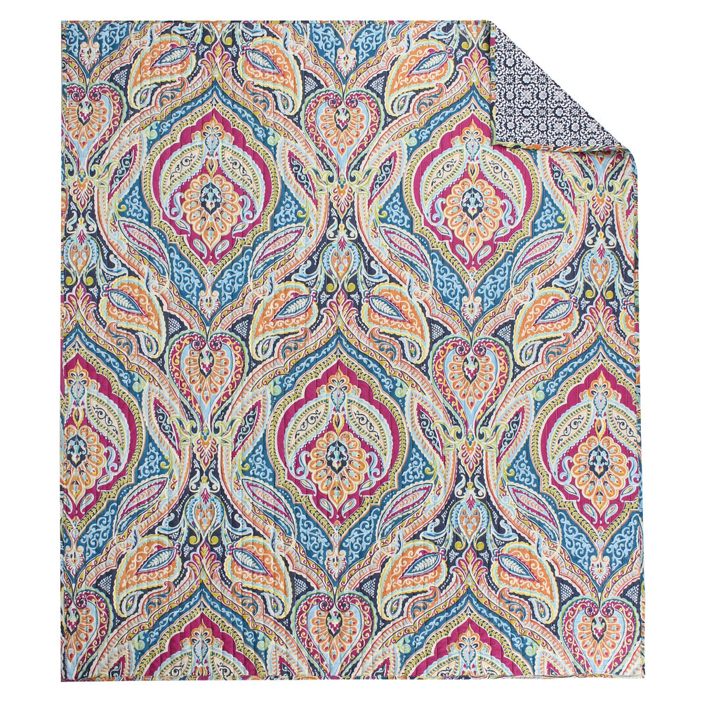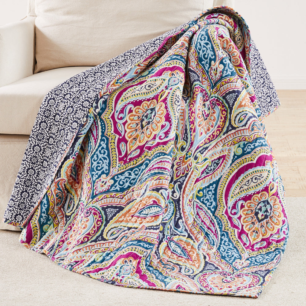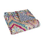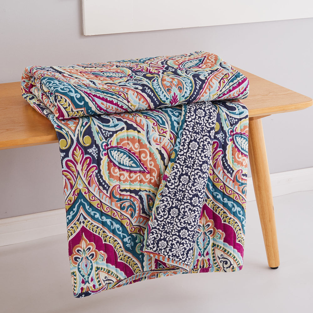 The Magnolia Throw by Levtex Home inspired by bright woven woolen scarves and tapestries. Offered in shades of multicolor, this design will immediately transform your bedroom. Made with the softest lightweight cotton, this reversible quilt features a bright and bold medallion print on the one side, reversing to a navy and white gate design on the other. The Throw (50x60in.) has a cotton front and cotton back, filled with a cotton-rich filler, and is machine washable. Enjoy this for years to come!