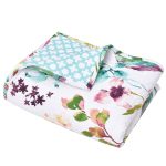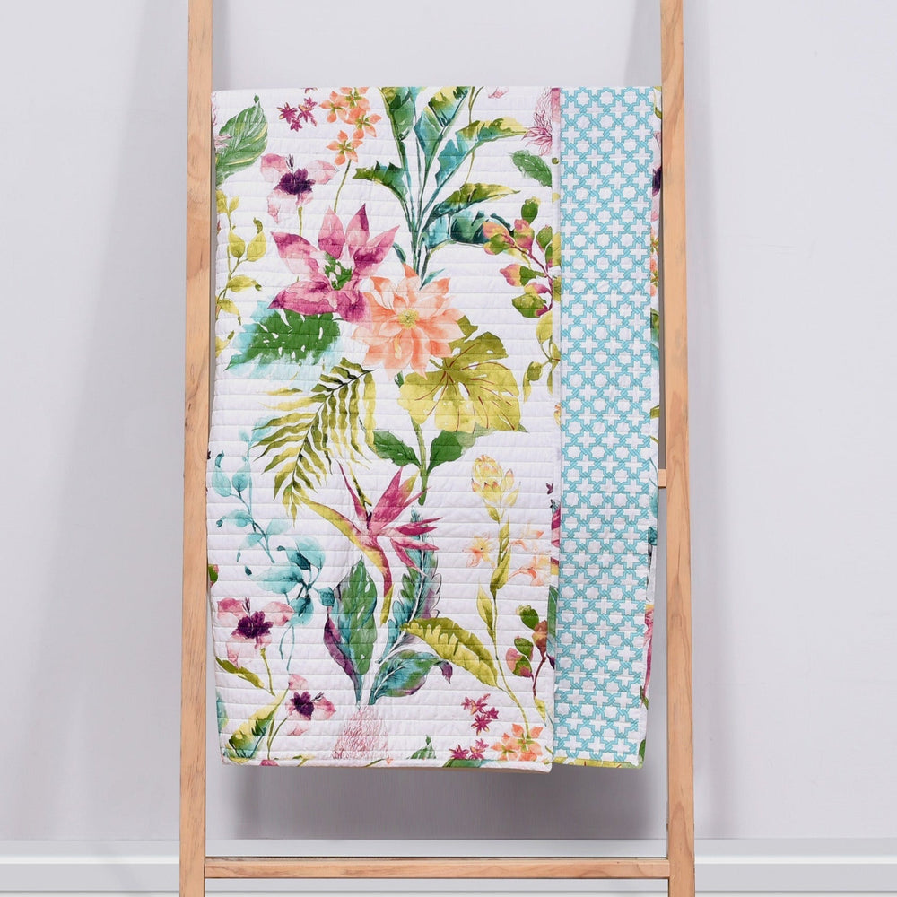 The Malana Reversible Quilted Throw by Levtex Home is inspired by a lush tropical garden. This selection of tropical flowers and leaves design will immediately transform your bedroom. Made with the softest lightweight cotton, this reversible throw features a beautiful painterly depiction of tropical flowers and leaves, reversing to a interlocking gate design on the other. The Quilted Throw is perfectly sized at 50x60in., is machine washable and is filled with a cotton-rich filler (that includes cotton, polyester and other fibers). Enjoy this for years to come!