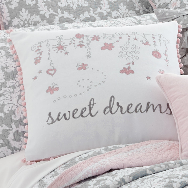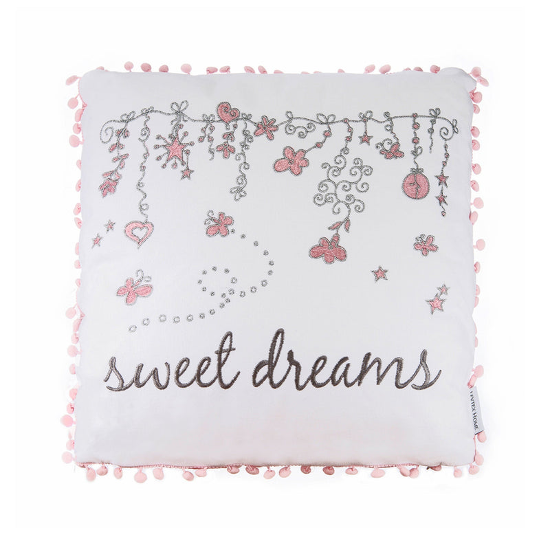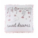 The Sweet Dreams decorative pillow matches perfectly with the Levtex Home Margaux bedding collection. This kid’s pillow is sized at 18x18in. and features the phrase ‘sweet dreams’ stitched in silver font with flowers, stars, and butterflies in complement, along with pink pom poms on the edges.?? The white, silver, and pink color palette makes this a versatile accessory for your kid’s bed or favorite chair. The pillow comes pre-filled with a soft, polyester inner.
