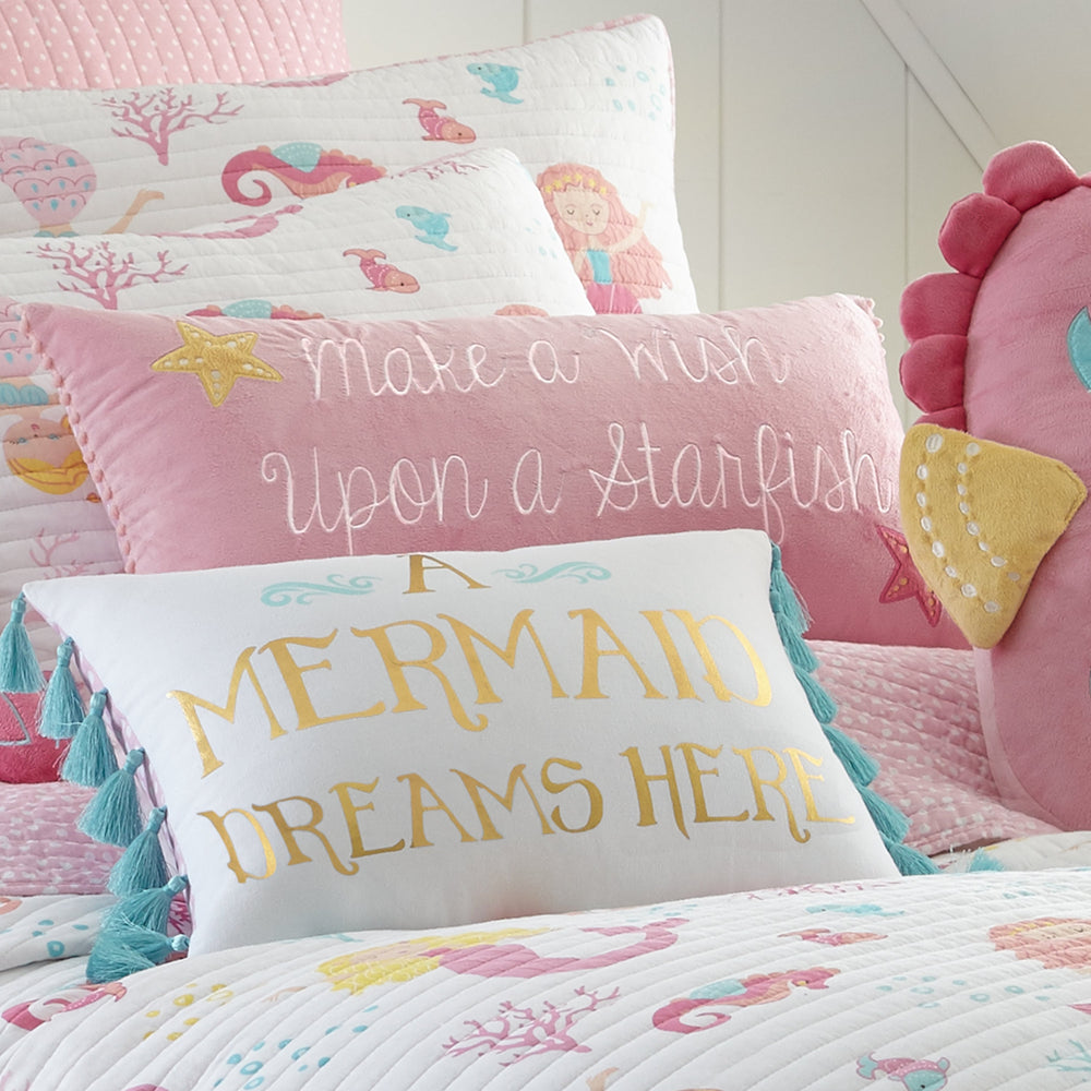 The Make a Wish decorative pillow matches perfectly with the Levtex Home Marina bedding collection. This kid’s pillow is sized at 12x24in. and features the phrase ‘Make a Wish Upon a Starfish’ embroidered on a pink ground with complementing starfish in the corners and pink pom poms. The pink, yellow, and white color palette makes this a versatile, fun accessory for your child. The pillow comes pre-filled with a soft polyester inner.