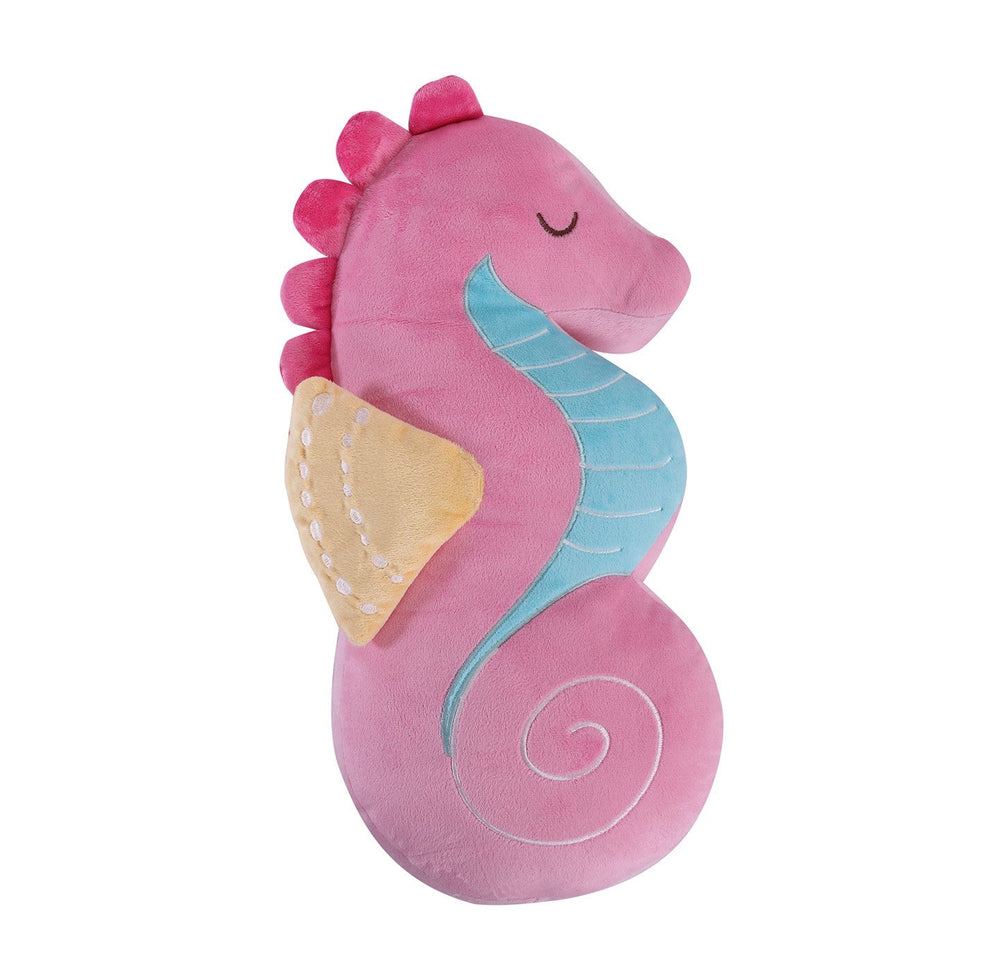 The Seahorse decorative pillow matches perfectly with the Levtex Home Marina bedding collection. This kid’s pillow is sized at 18in. H and features a cute and cuddly seahorse-shaped form in pink with gold and blue accents. The pink, yellow, blue, and white color palette makes this a versatile, fun accessory for your child. The pillow comes pre-filled with a soft polyester inner.