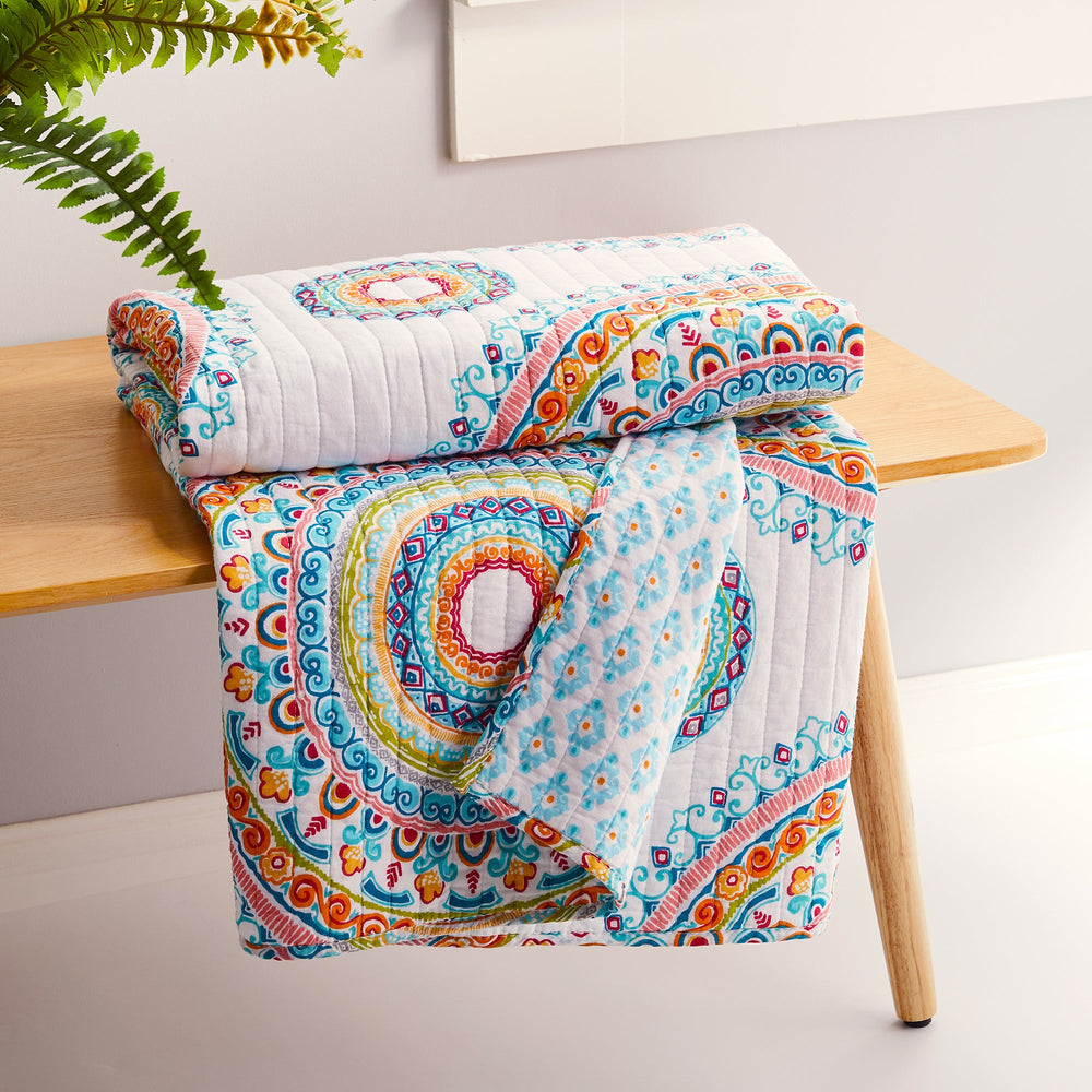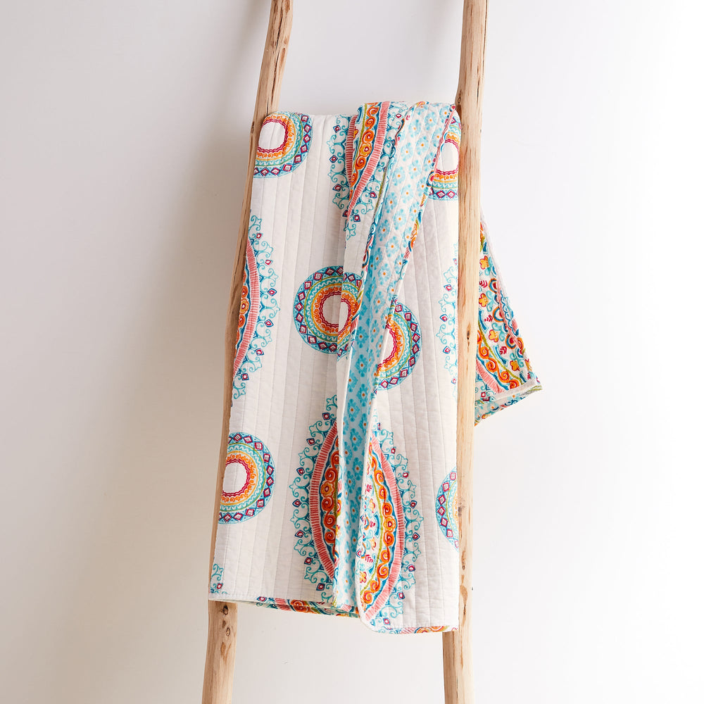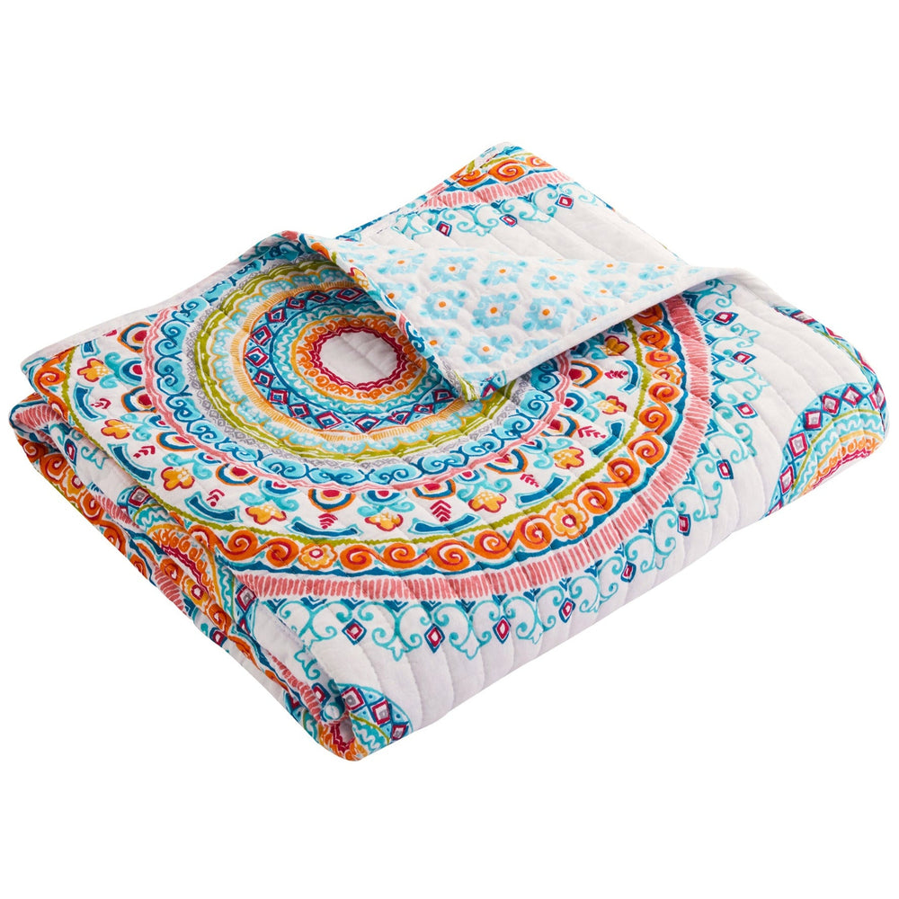 The Mayla Quilted Throw by Levtex Home is inspired by the intricate patterning in bright woven scarves. This bright design will immediately transform your home. Made with the softest lightweight cotton, this reversible quilted throw features a cascade of bright medallions on the one side, reversing to a multicolor ditsy ikat medallion on the other. The Quilted Throw is machine washable and filled with a cotton-rich filler (that includes cotton, polyester and other fibers) and is sized at 50x60in. Enjoy this for years to come!