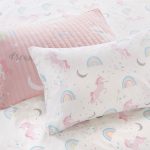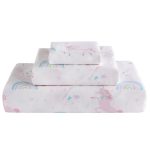 The Melody Twin Kids Sheet Set by Levtex Home is inspired by a dreamy fairytale world. Offered in pink, teal, purple, yellow and white, this design will immediately transform your kid’s bedroom. The design features a cute tossed pattern of dancing unicorns and rainbows on a white background, with hearts and stars complement. The set includes a Twin fitted sheet (39×75), a top sheet (66x96in.), and a matching pillow case (21x30in.). Your kid will surely enjoy this for years to come!
