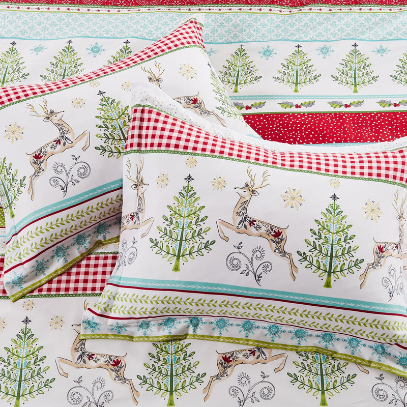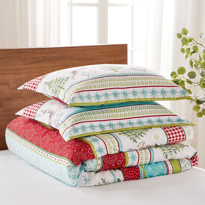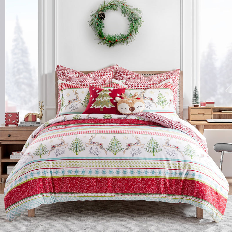 The Comet & Cupid Duvet Cover/Comforter Set by Merry & Bright by Levtex Home is holiday cheer. Offered in red, green white and teal, this design will immediately transform your bedroom. Made with a soft and luxurious polyester, this Duvet Cover/Comforter Set features a fun, whimsical holiday. It has rows of deer, Christmas trees, plaids and patterns on the front and a red and white sweater print on the reverse. Duvet Cover closes with easy to use, durable buttons. The Comet & Cupid Duvet Cover/Comforter Set is machine washable. Enjoy this for years to come!