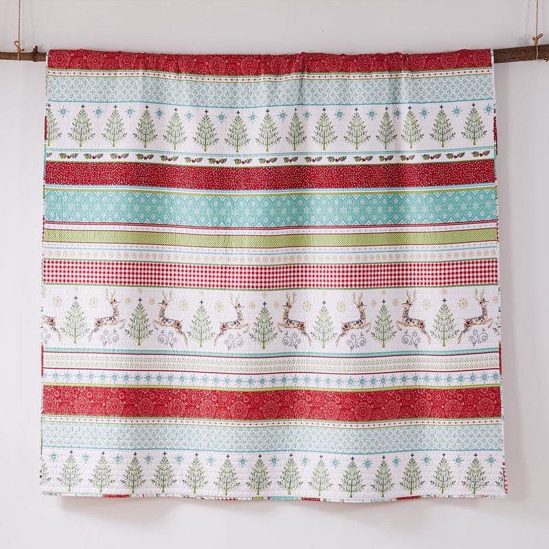 The Comet and Cupid Reversible Quilt by Merry & Bright for Levtex Home is inspired by painted folk Christmas scenes. Offered in red, green white and teal, this design will immediately transform your bedroom. This reversible quilt features rows of deer, Christmas trees, plaids and patterns on the front, reversing to a red and white sweater print on the back. The Quilt is microfiber, filled with a cotton rich filler and is machine washable. Enjoy this for years to come!