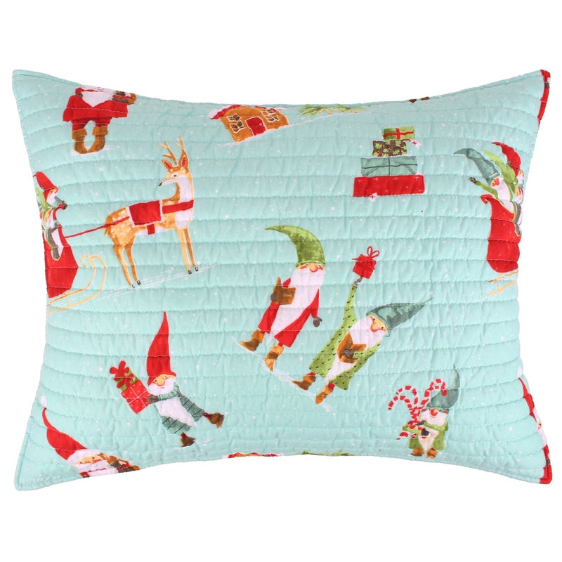 The Gnome for the Holidays Quilted Standard Sham by Merry & Bright for Levtex Home is inspired by holiday stories and children’s holiday paintings. Offered in red, white, green, teal and taupe, this design will immediately transform your bedroom. These shams feature gnomes dressed for Christmas, riding sleighs and bringing gifts on the front, reversing to a red and white check on the back. The Standard Sham (26x20in.) is microfiber, quilted with a cotton rich filler and is machine washable. Pillow inner not included. Enjoy this for years to come!