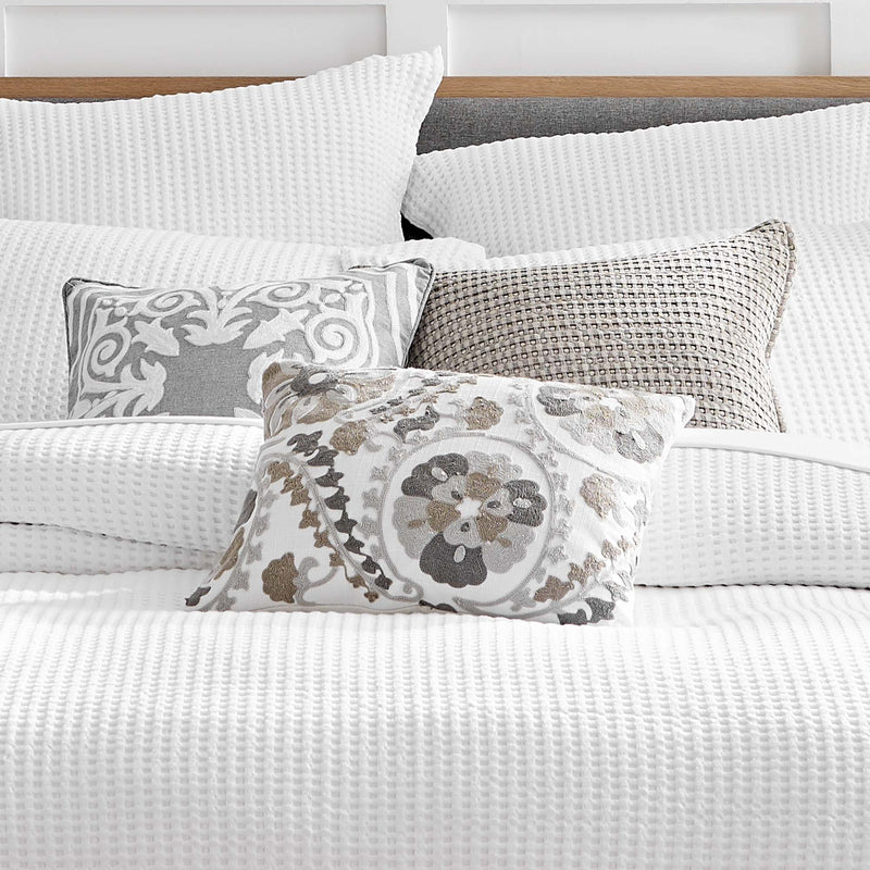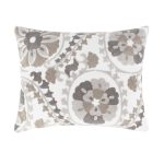The crewel embroidered suzani decorative pillow matches perfectly with the Levtex Home Mills bedding collection. This pillow is sized at 14x18in. and features intricate crewel embroidered suzani of greys and taupe on a white ground The light grey, taupe, dark grey, white color palette makes this a versatile accessory for your bed, couch or favorite chair. The pillow comes pre-filled with a soft, luxurious feather inner.