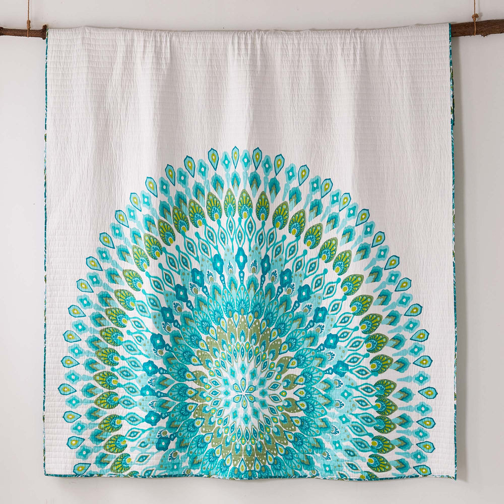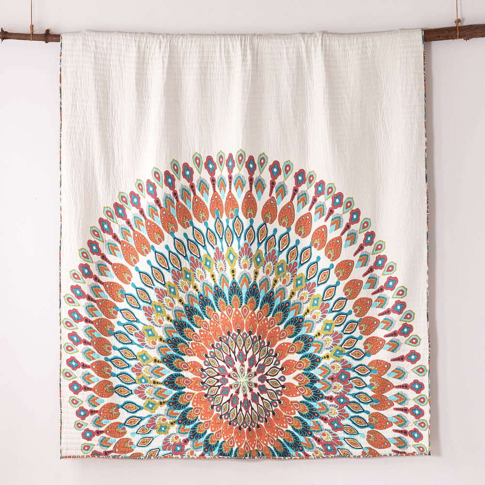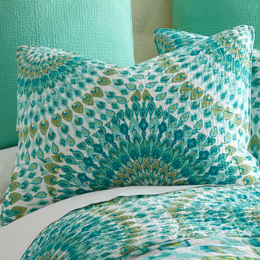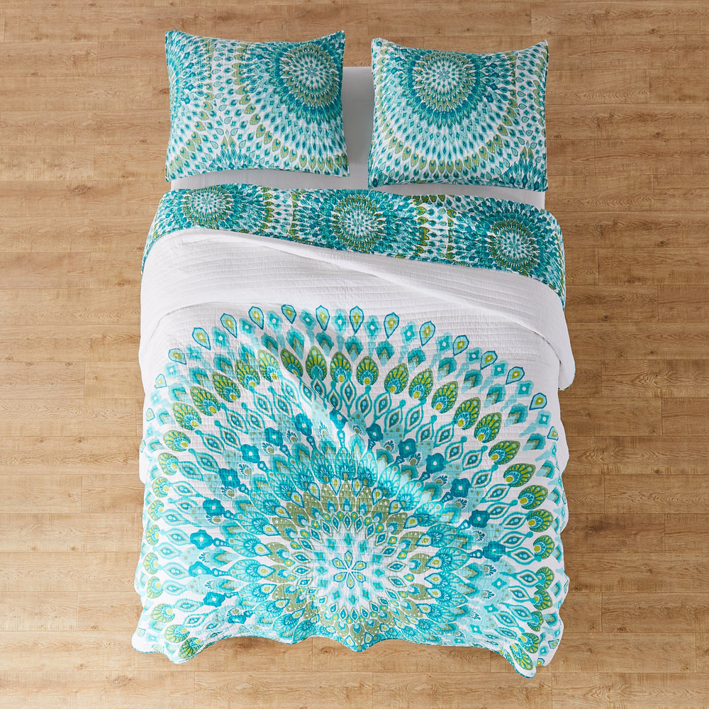 The Mirage Reversible Quilt Set by Levtex Home is inspired by a lively bazaar. Offered in shades of orange, teal, pink and green or in teal, this design will immediately transform your bedroom. Made with the softest lightweight cotton, this reversible quilt features a marge mandala that envelopes the bottom of your bed one side, reversing to an overlapping medallion pattern on the other. The Quilt Set has a cotton rich filler and is machine washable. Enjoy this for years to come!