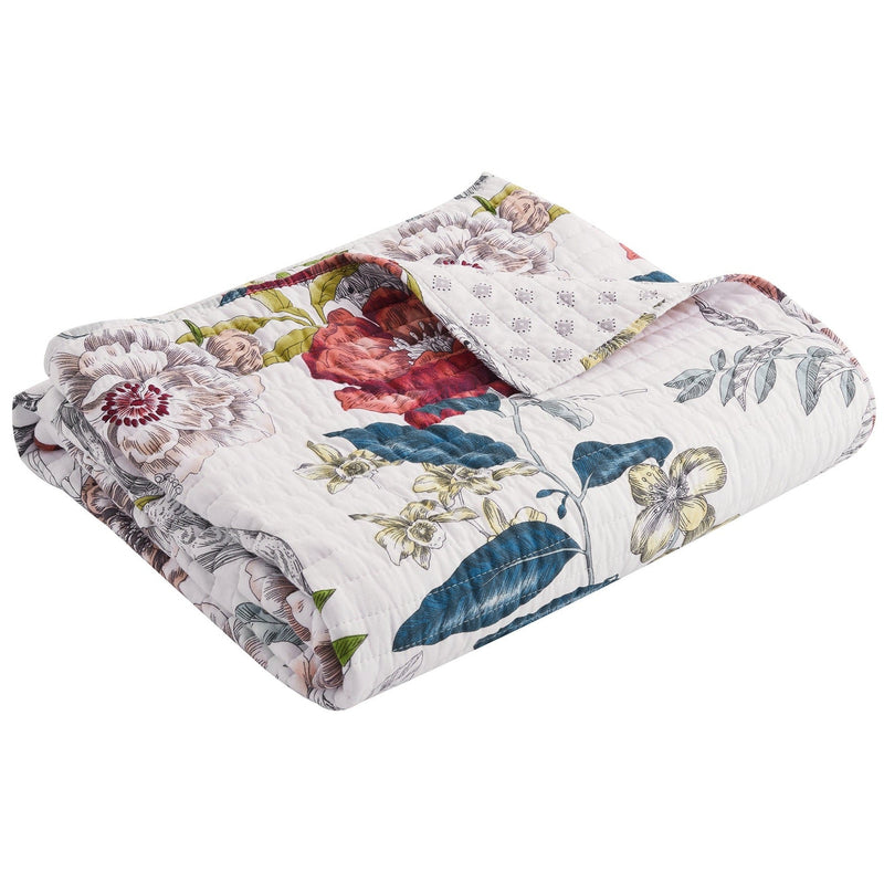 The Montecito Reversible Quilted Throw by Levtex Home is inspired by hand painted European murals. This intricate floral design will immediately transform your bedroom. Made with the softest lightweight cotton, this reversible throw features a toile-like peacock and flowers surrounded by vibrant colorful flowers, reversing to a grey and white medallion on the other. The Quilted Throw is perfectly sized at 50x60in., is machine washable and is filled with a cotton-rich filler (that includes cotton, polyester and other fibers). Enjoy this for years to come!