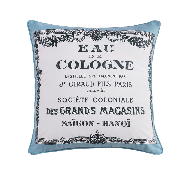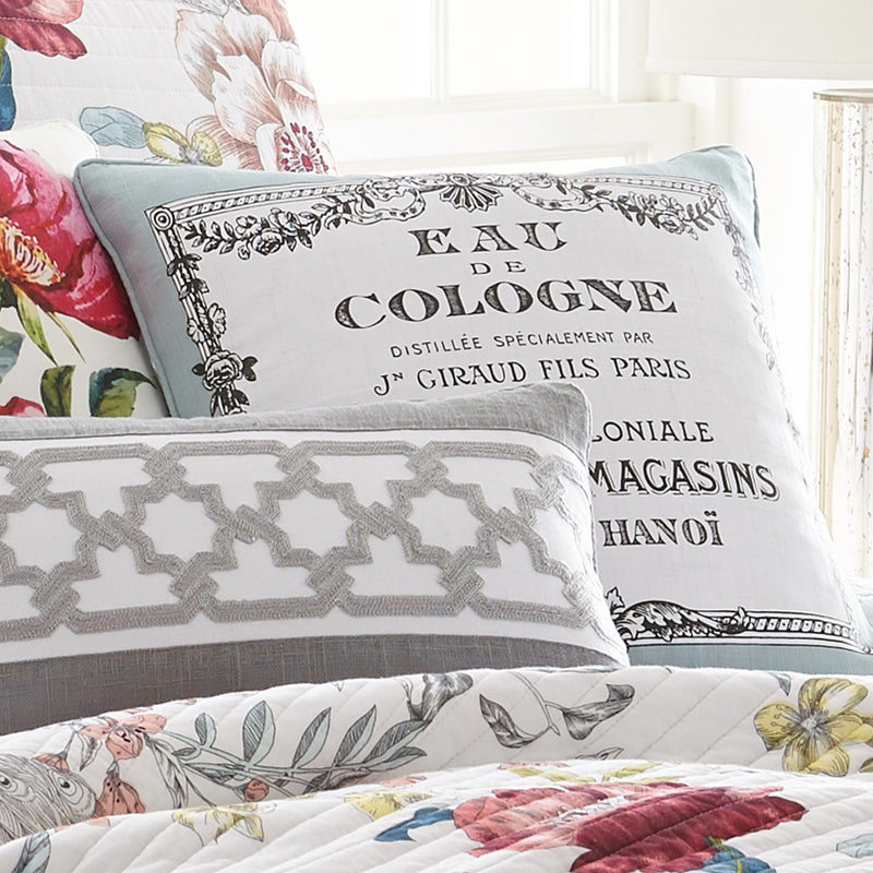 The Eau De Cologne decorative pillow matches perfectly with the Levtex Home Montecito bedding collection. This pillow is sized at 18 x 18in. and features a take on a vintage Eau De Cologne label screenprinted in charcoal and white on a grey canvas ground. The color palette makes this a versatile accessory for your bed, couch or favorite chair. The pillow comes pre-filled with a soft. luxurious feather inner.