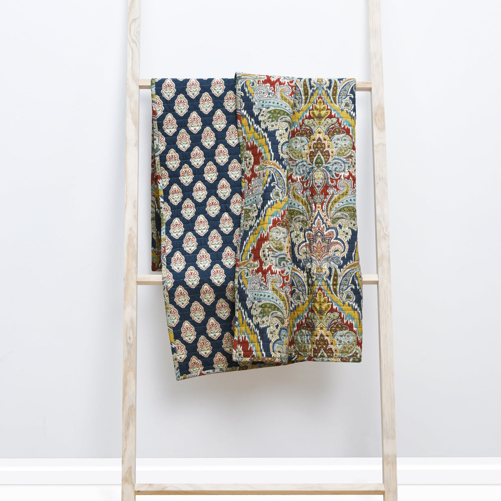 The Moreno Reversible Quilted Throw by Levtex Home is inspired by rich traditional woven tapestries. Offered in shades of red, blue, grey and gold, this design will immediately transform your bedroom. Made with the softest lightweight cotton, this throw features a classic damask pattern on the one side, reversing to a small repeating motif on a blue ground on the other. The Quilted Throw is machine washable and is sized at 50x60in. Enjoy this for years to come!
