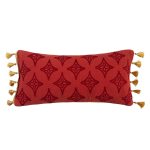 The Crewel Embroidered decorative pillow perfectly complements the Levtex Home Moreno bedding collection. This pillow is sized at 12 x 24in. and features a rich slub red fabric, beautifully detailed with crewel embroidery and trimmed with gold tassels. The color palette makes this a versatile accessory for your bed, couch or favorite chair. The pillow comes pre-filled with a soft, luxurious feather inner.