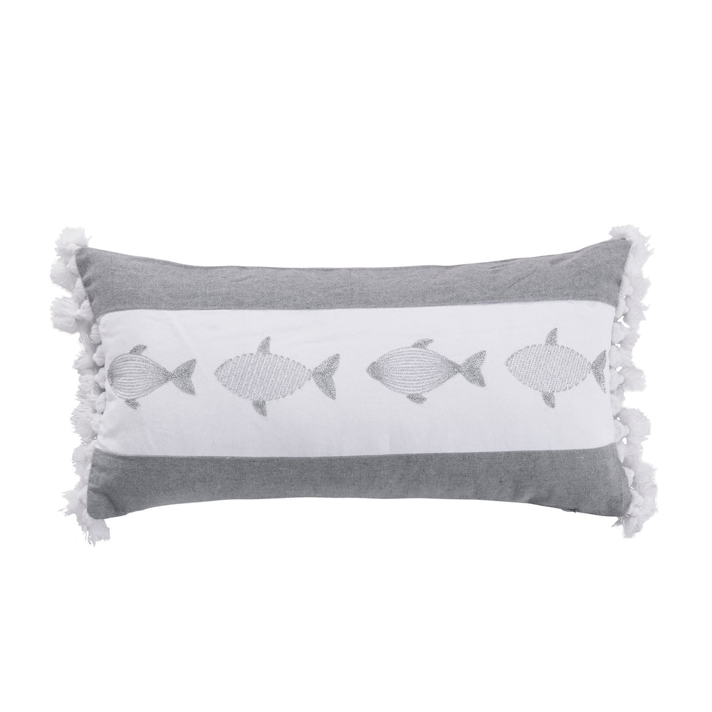 The Fish decorative pillow matches perfectly with the Levtex Home Nantucket bedding collection. This pillow is sized at 12x24in. and features delicately detailed fish embroidered in silver thread on a grey & white classic natural canvas ground. The soothing, coastal color palette makes this a versatile accessory for your bed, couch or favorite chair. The pillow comes pre-filled with a luxurious feather inner.