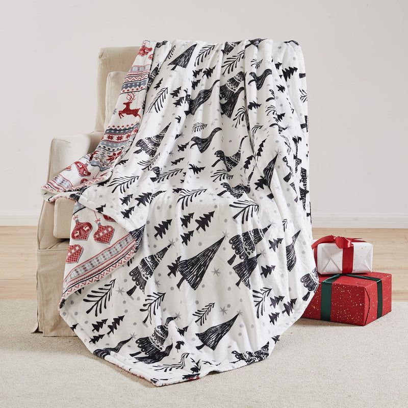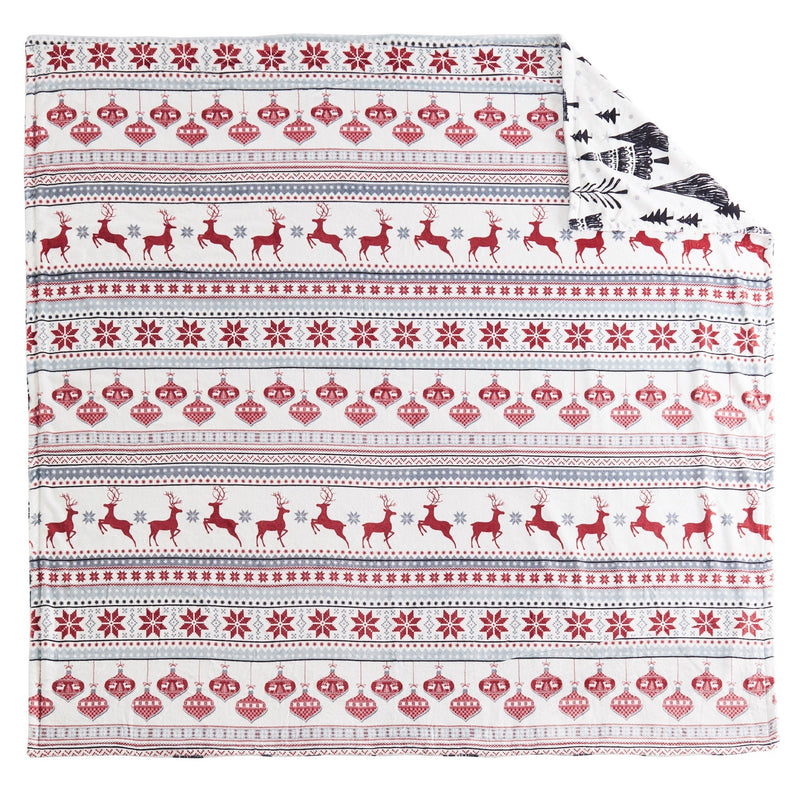The Northern Star Reversible Blanket by Levtex Home is inspired by a contemporary Christmas landscape. This design will immediately transform any room into a Christmas wonderland. This reversible, cozy, thick blanket features decorative Christmas tree design on the front, reversing to printed rows of deer, ornaments and snowflakes on the back. The blanket (68x68in.) is polyester and is machine washable. Make this classic a part of your special holiday tradition.