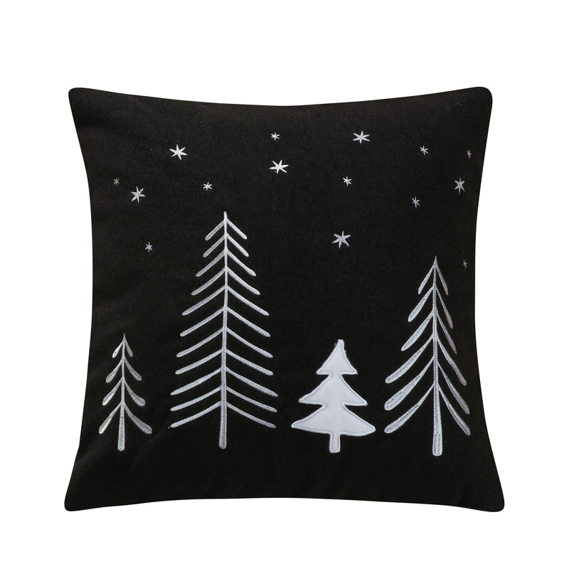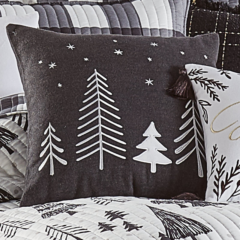 The Black and White Trees decorative pillow matches perfectly with the Levtex Home Northern Star bedding collection or can be used to bring the holiday spirit into any room in your home. This pillow is sized at 18x18in. and features appliqued and embroidered Christmas trees in black against a crisp white ground set off by twinkling Christmas stars above. A versatile accessory for your bed, couch or favorite chair. The pillows comes pre-filled with a soft luxurious feather inner. Bring the holidays home!