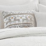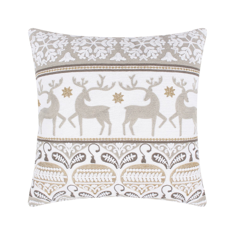 The Reindeer decorative pillow matches perfectly with the Levtex Home O Christmas Tree bedding collection. This pillow is sized at 18x18in. and features intricately stitched rows of reindeer and ornaments in an array of neutral tones on a textured ground. The taupe, cream color palette makes this a versatile accessory for your bed, couch or favorite chair. The pillow comes pre-filled with a soft, luxurious feather inner.