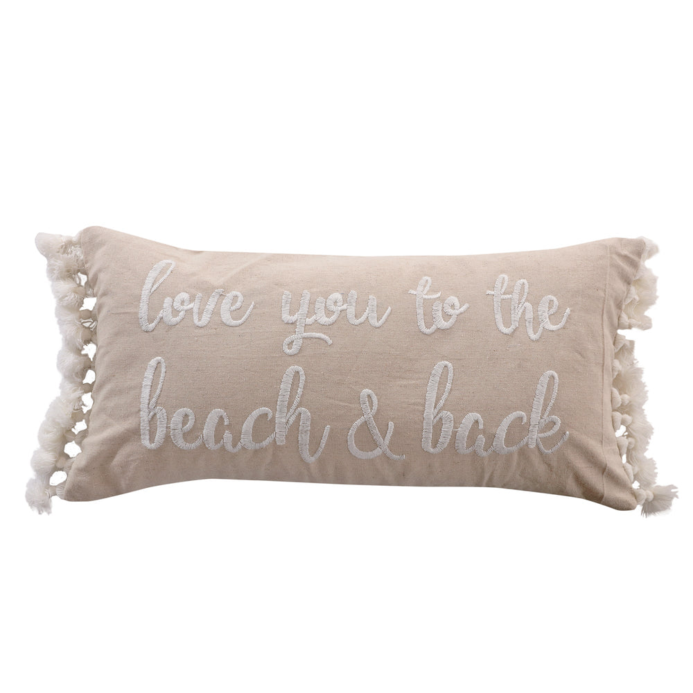 The Beach and Back decorative pillow matches perfectly with the Levtex Home Palmira bedding collection. This pillow is sized at 12x24in. and features the words LOVE YOU TO THE BEACH AND BACK embroidered in white thread on a durable natural beige canvas ground with side tassels in complement. The soothing, coastal color palette makes this a versatile accessory for your bed, couch or favorite chair. The pillow comes pre-filled with a luxurious feather inner.