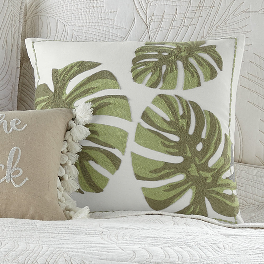 The Palm decorative pillow matches perfectly with the Levtex Home Palmira bedding collection. This pillow is sized at 18x18in. and features embroidered monstera leaves and a stitch border in different shades of green thread on a white canvas ground. The soothing, coastal color palette makes this a versatile accessory for your bed, couch or favorite chair. The pillow comes pre-filled with a luxurious feather inner.