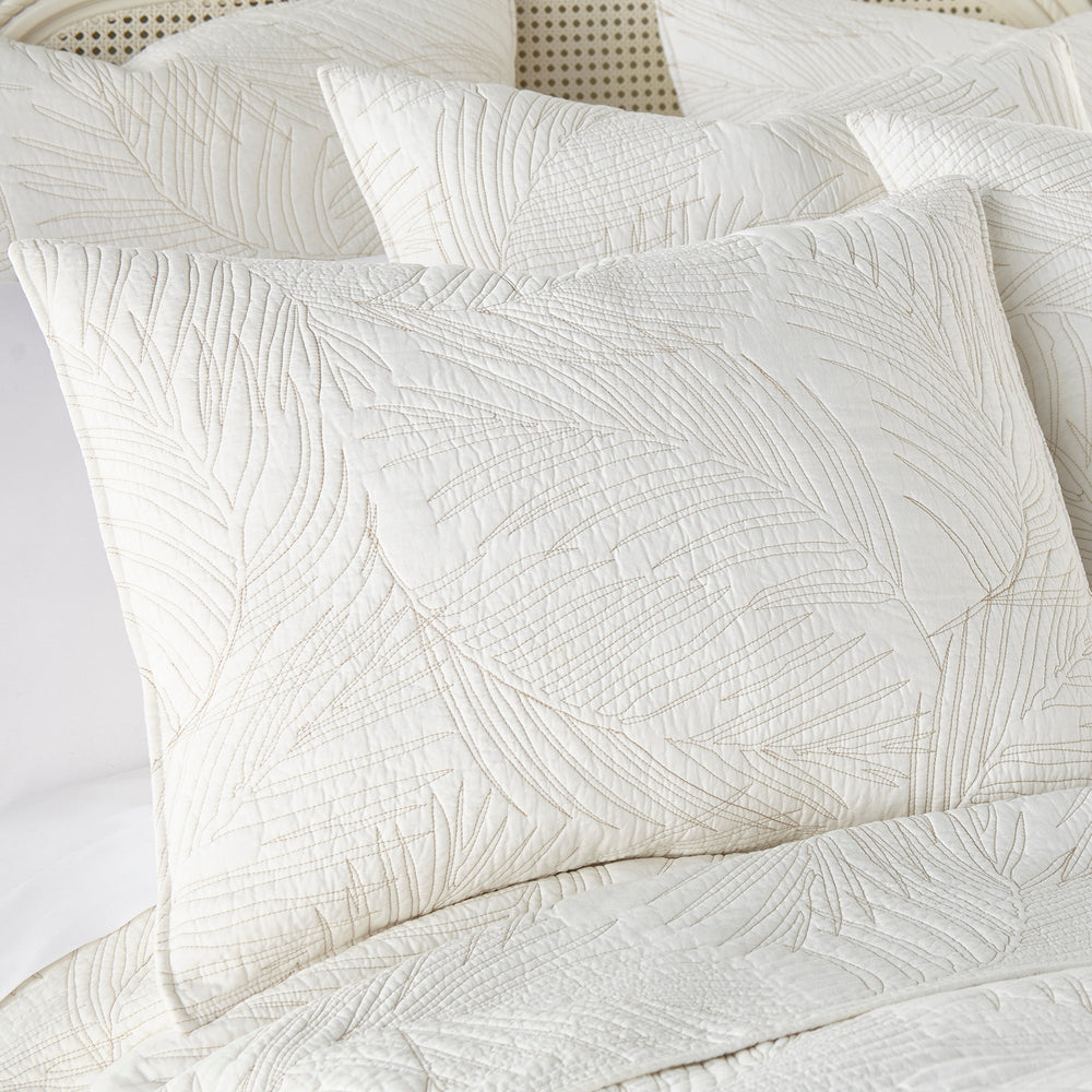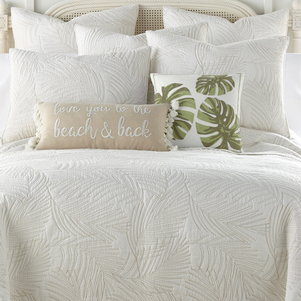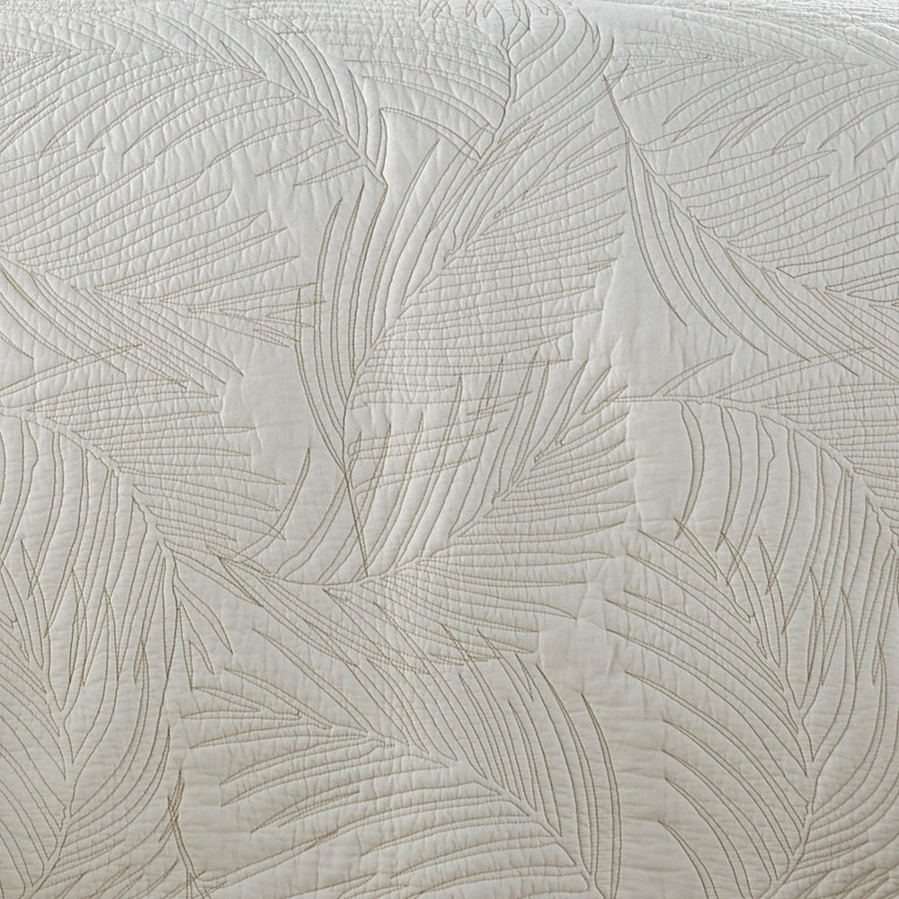 The Palmira Reversible Quilt Set by Levtex Home is inspired by a relaxing tropical vacation. This white and beige design will immediately transform your bedroom. Made with the softest lightweight cotton, this reversible Quilt Set features a simple yet elegant palm leaves pattern stitched on both sides in beige thread on a rich white cotton ground. The Quit Set is machine washable. Enjoy this for years to come!