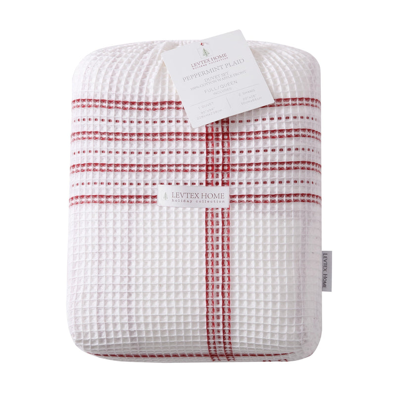 The Peppermint Plaid Duvet Cover/Comforter Set by Levtex Home is hip and contemporary. Offered in red and cream, this design will immediately transform your bedroom. Made with a soft and luxurious cotton, this duvet cover set features a woven waffle with a holiday plaid in red on a cream ground. It has a plaid woven waffle with a distinctive holiday pattern on the front and a solid cotton on the reverse. The Duvet Cover closes with easy to use, durable buttons. The Peppermint Plaid Duvet Cover/Comforter Set is machine washable. Enjoy this for years to come!