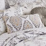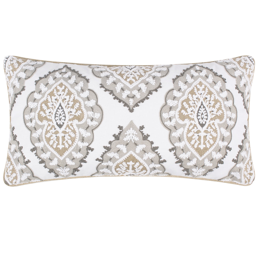 The Medallions decorative pillow perfectly complements the Levtex Home Pisa bedding collection. This pillow is sized at 12 x 24in. and features intricately crewel stitched medallions in grey, taupe, charcoal and white on a white ground. The color palette makes this a versatile accessory for your bed, couch or favorite chair. The pillow comes pre-filled with a soft, luxurious feather inner.