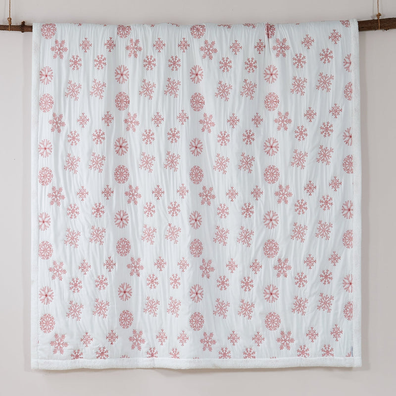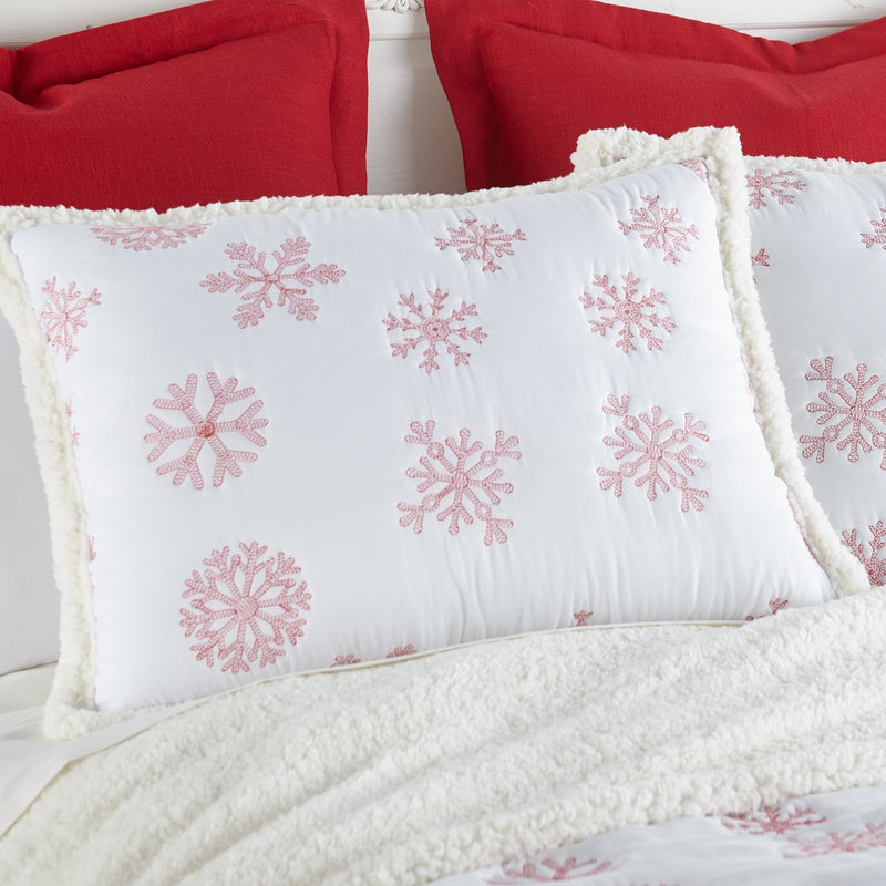 The Red Snowflake Sherpa Reversible Quilt Set by Levtex Home is inspired by a traditional winter lodge. Offered in red and white, this design will immediately transform your bedroom. Made with the softest pre-washed cotton, this reversible quilt features a pattern of red snowflakes embroidered on an off-white ground, reversing to a cream solid microfiber back and edged with a soft, cozy sherpa. The Quilt Set is filled with a cotton-rich filler (that includes cotton, polyester and other fibers) and is machine washable. Bring the holidays home!
