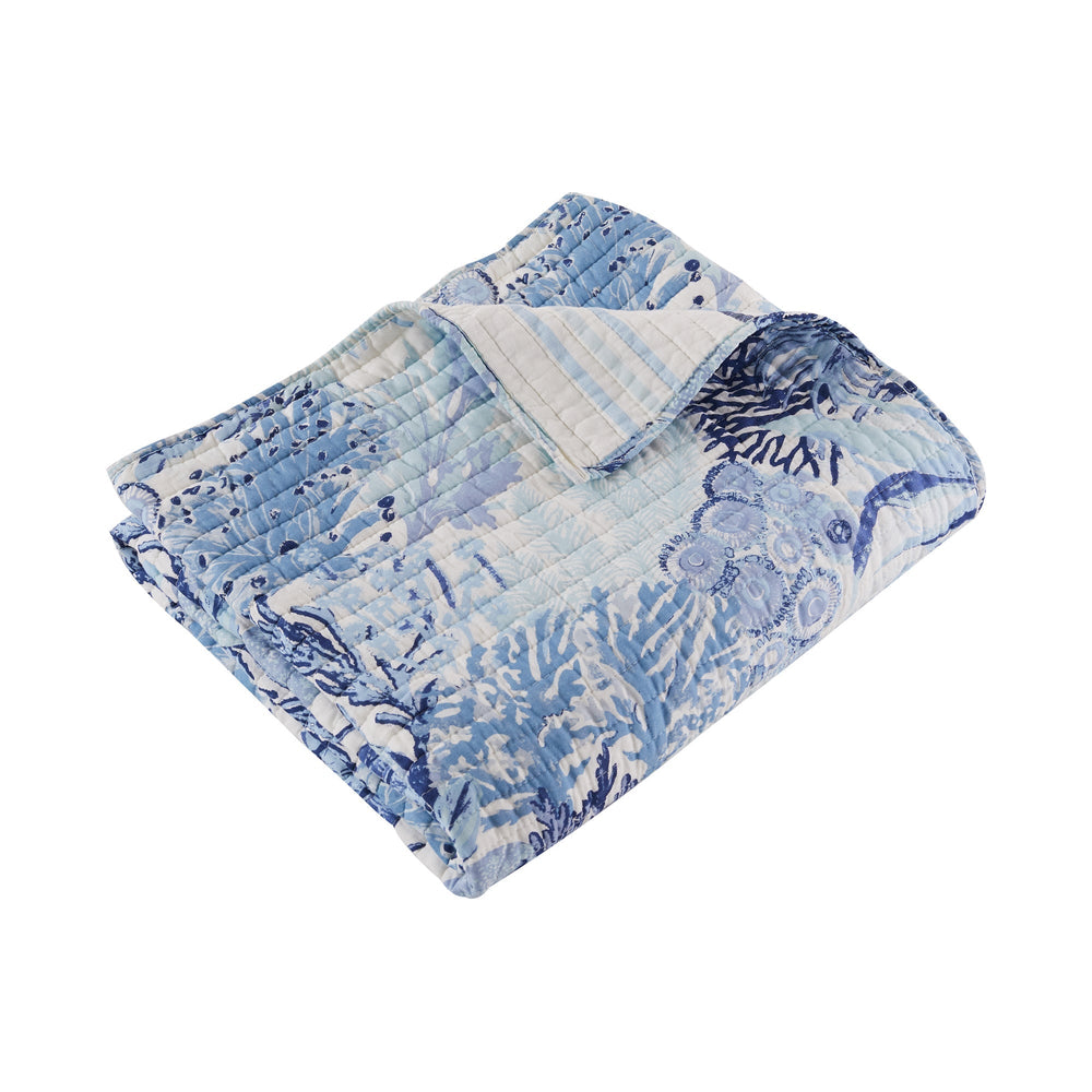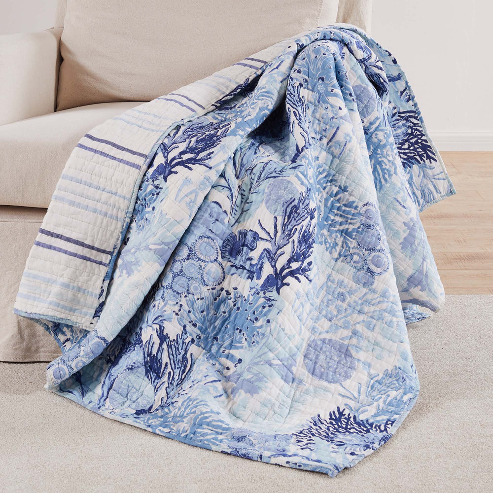The Reef Dream Reversible Throw by Levtex Home is inspired by a deep dive around the corals of the Caribbean. Offered in a myriad of blue colors on a white ground, this design will immediately transform any room in your home. This throw features a wonderful collection of coral, anemones and shells on the front, reversing to a combination of blue stripes on the back. The Throw (50x60in.) has a cotton front and cotton back, filled with a cotton-rich filler, and is machine washable. Enjoy this for years to come!