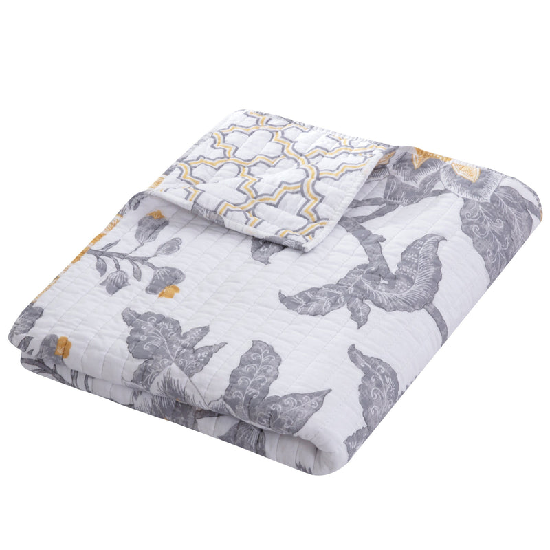 The Reverie Reversible Quilted Throw by Levtex Home is inspired by a garden after a spring shower. This detailed floral design will immediately transform your bedroom. Made with the softest lightweight cotton, this reversible throw features a grey, yellow, and white floral, reversing to a yellow, grey, and white geometric pattern on the other. The Quilted Throw is perfectly sized at 50x60in., is machine washable and is filled with a cotton-rich filler (that includes cotton, polyester and other fibers). Enjoy this for years to come!