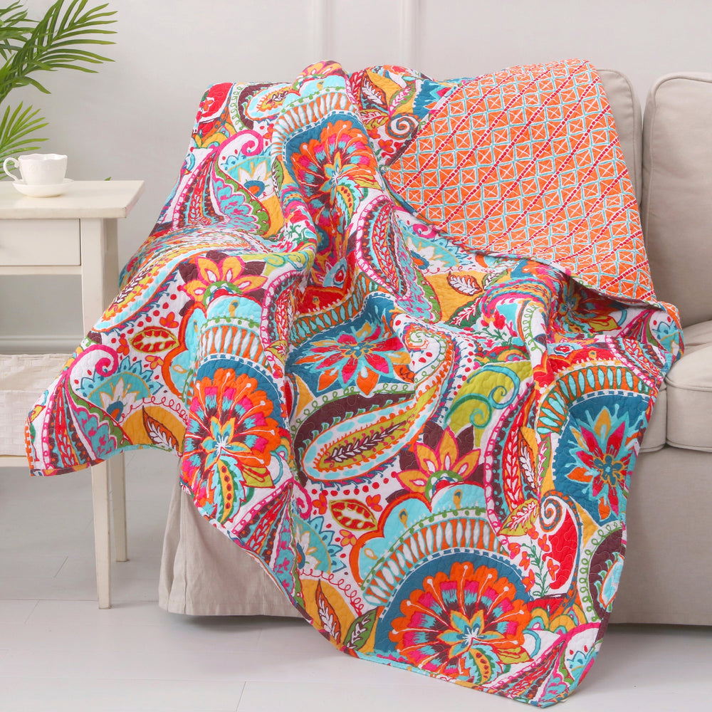 The Rhapsody Reversible Quilted Throw by Levtex Home is inspired by bohemian paisley patterns. This Yellow, Orange, Red, Green, and Blue design will immediately transform your bedroom. Made with the softest lightweight cotton, this reversible throw features a fun, hip mix of oranges, reds, yellow, greens, and blues, reversing to a ikat diamonds in orange, red and blue on the other. The Quilted Throw is perfectly sized at 50x60in., is machine washable and is filled with a cotton-rich filler (that includes cotton, polyester and other fibers) Enjoy this for years to come!