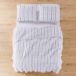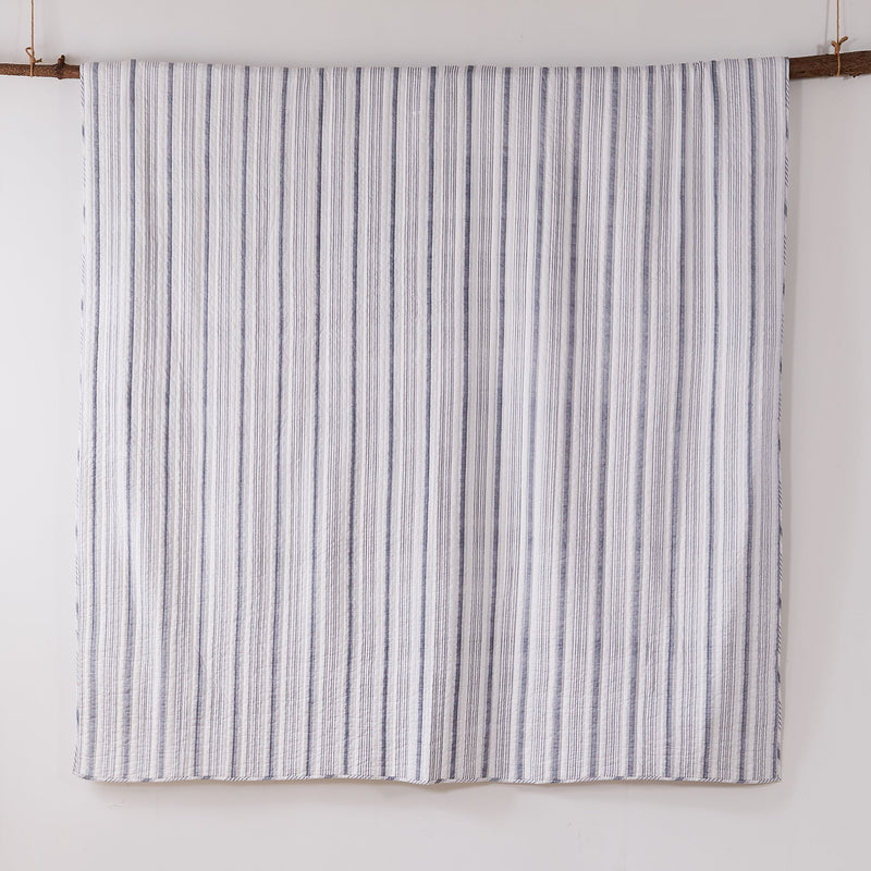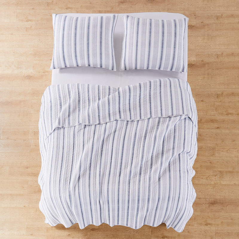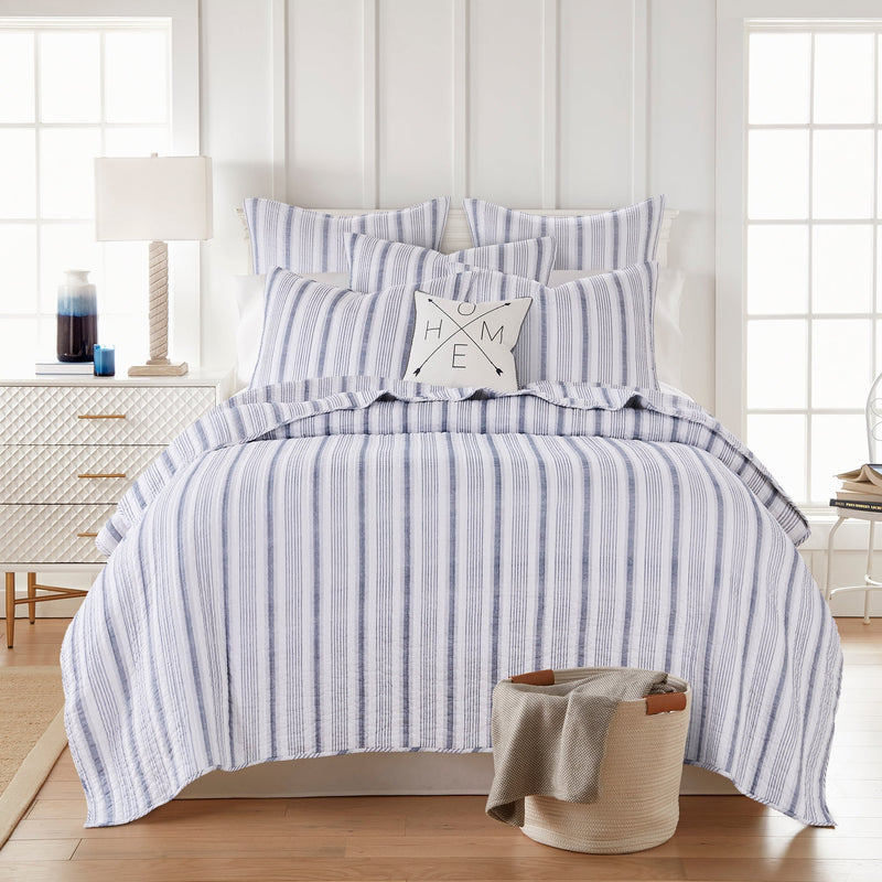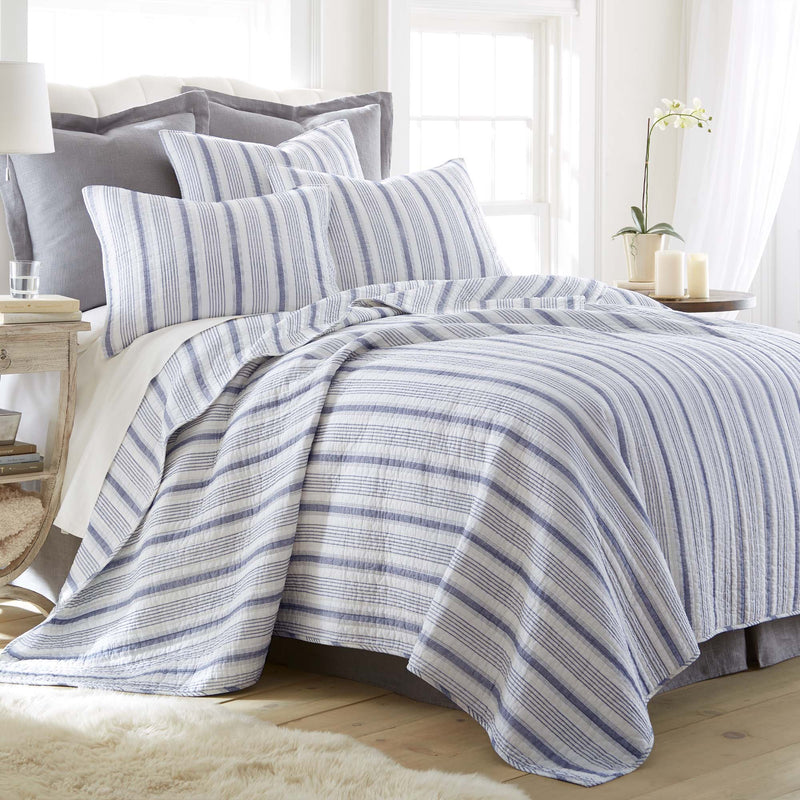 The Rochelle Reversible Quilt Set by Levtex Home is inspired by classic French farmhouse stripes. Offered in shades of navy and cream, this design will immediately transform your bedroom. Made with the softest lightweight cotton, this reversible quilt features a classic, traditional stripe on the one side, reversing to itself. The Quilt Set has a cotton rich filler (90% cotton, 7% rayon, 3% other fibers) and is machine washable. Enjoy this for years to come!