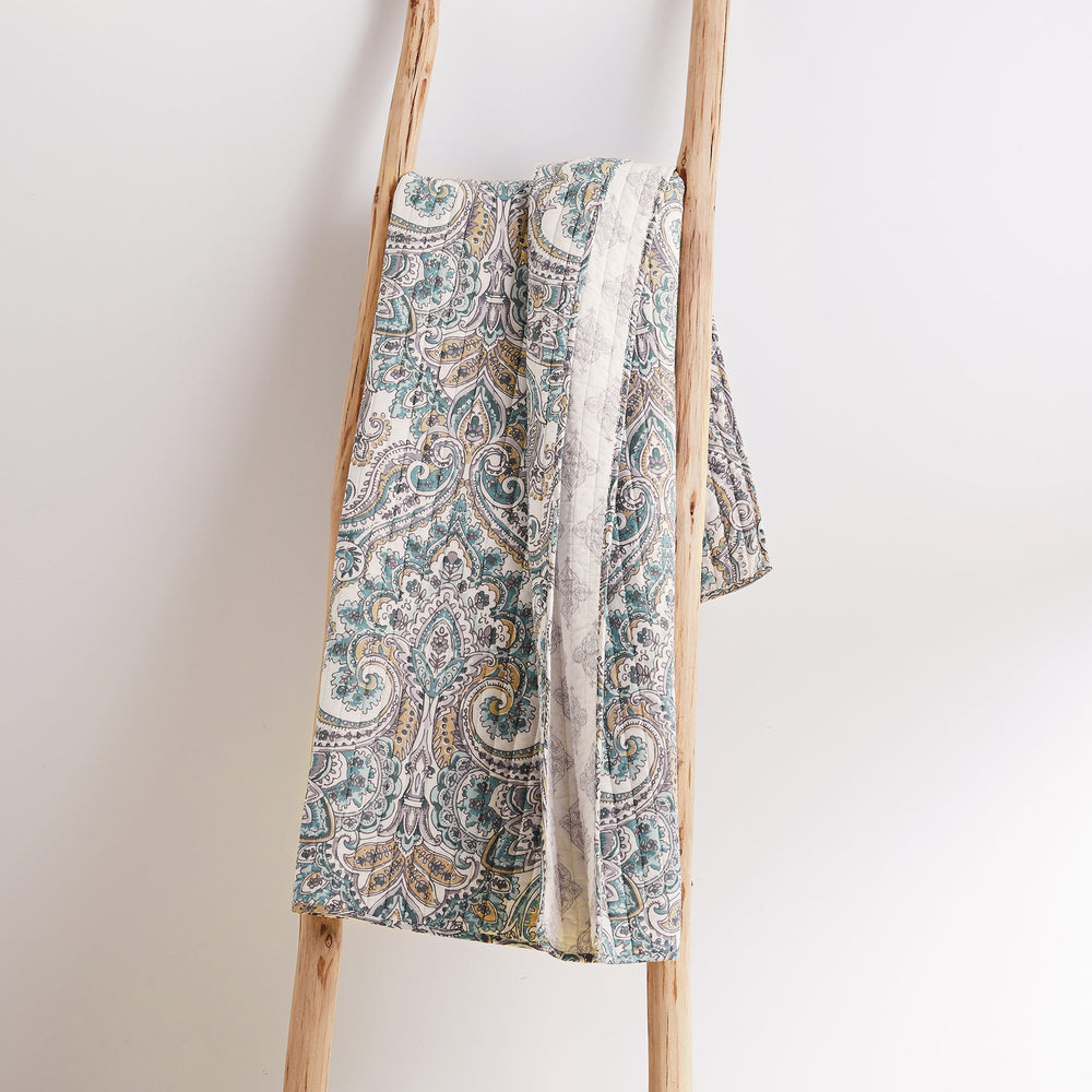 The Rome Reversible Quilted Throw by Levtex Home is inspired by ancient architecture. This intricate paisley design will immediately transform your bedroom. Made with the softest lightweight cotton, this reversible throw features a beige, blue, and white paisley, reversing to a grey and white mini medallions on the other. The Quilted Throw is perfectly sized at 50x60in., is machine washable and is filled with a cotton-rich filler (that includes cotton, polyester and other fibers). Enjoy this for years to come!