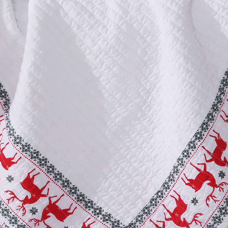 The Rudolph Reversible Quilted Throw by Levtex Home is inspired by simple Scandinavian design. Offered in red, grey and white, this design will immediately transform your bed, couch or favorite chair. Made with the softest lightweight brushed microfiber, this reversible throw features a white ground quilted with an x stitch and a printed border of reindeer and snowflakes on the one side, reversing to the border design expressed as a stripe on the other. The Quilted Throw is machine washable, is filled with a cotton-rich filler (that includes cotton, polyester and other fibers) and is sized at 50x60in. Snuggle up under this versatile throw while you watch the lights on your Christmas tree twinkle, or tell your favorite holiday stories.