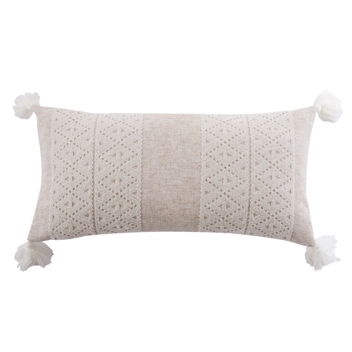 The Applique Diamond decorative pillow matches perfectly with the Levtex Home Sanira bedding collection. This pillow is sized at 12 x 24in. and features an intricate diamond patterned trim appliqued onto a textured heathered ground and finished with tassels in each corner. The color palette makes this a versatile accessory for your bed, couch or favorite chair. The pillows comes pre-filled with a soft luxurious feather inner.