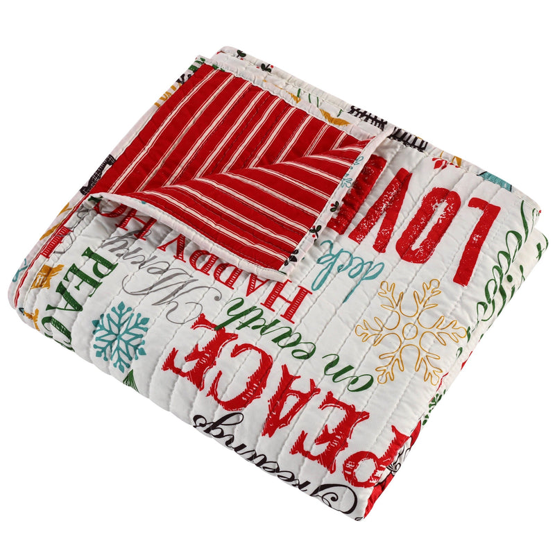 The Santa Claus Lane Reversible Quilted Throw by Levtex Home is inspired by the fun and wonder of the holiday season. Offered in multi-colored, this design will immediately transform your bed, couch or favorite chair. Made with the softest lightweight brushed microfiber, this reversible throw features a toss of Christmas words, lyrics and icons on the one side, reversing to a red and white stripe on the other. The Quilted Throw is machine washable, is filled with a cotton-rich filler (that includes cotton, polyester and other fibers) and is sized at 50x60in. Snuggle up under this versatile throw while you watch the lights on your Christmas tree twinkle, or tell your favorite holiday stories.