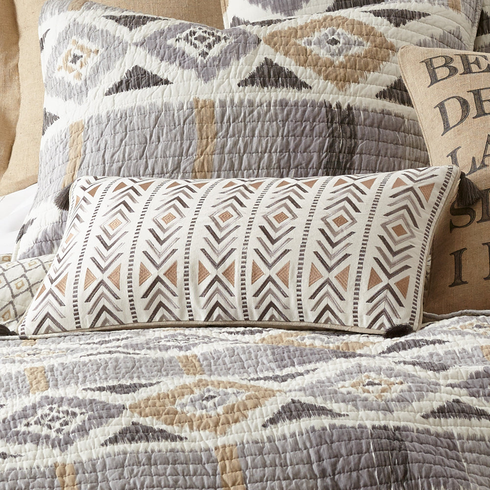 The Ikat Embroidered decorative pillow matches perfectly with the Levtex Home Santa Fe bedding collection. This pillow is sized at 12x24in. and features a striking geometric Ikat design in neutral greys, and white; bordered with tan linen and black corner pom poms to complete the look. The sophisticated color palette makes this a versatile accessory for your bed, couch or favorite chair. The pillow comes pre-filled with a luxurious polyester inner.