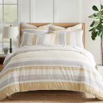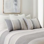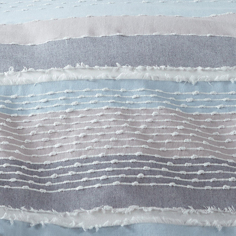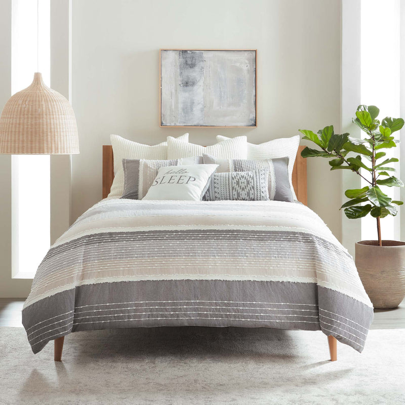 The Santander Duvet Cover/Comforter Set by Levtex Home is hip and contemporary. Offered in multiple colors, this design will immediately transform your bedroom. Made with a durable cotton, this set features a woven jacquard with knot and fray detailing on the front and a 100% cotton on the reverse. The Duvet Cover closes with easy to use, durable buttons. The Santander Duvet Cover/Comforter Set is machine washable. Enjoy this for years to come!