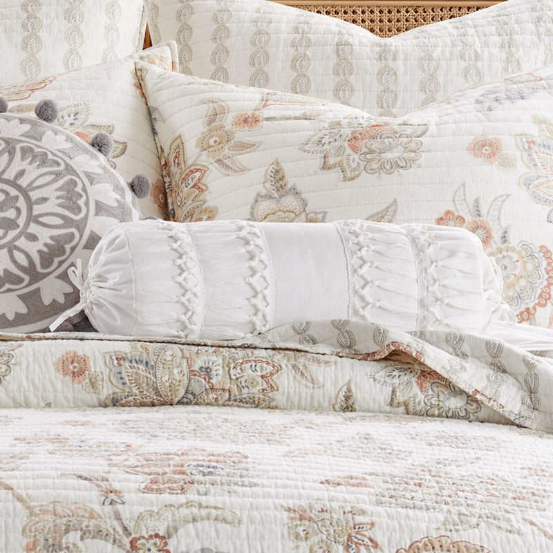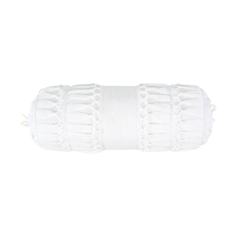 The Neckroll decorative pillow matches perfectly with the Levtex Home Selesta Blush bedding collection. This pillow is sized at 7in. X 18in. and features intricately detailed tassel trim appliques that create dimensional borders on this gorgeous white neckroll. The white color palette makes this a versatile accessory for your bed, couch or favorite chair. The pillow comes pre-filled with a soft, luxurious polyester inner.