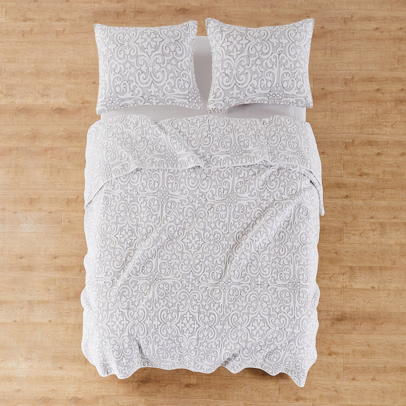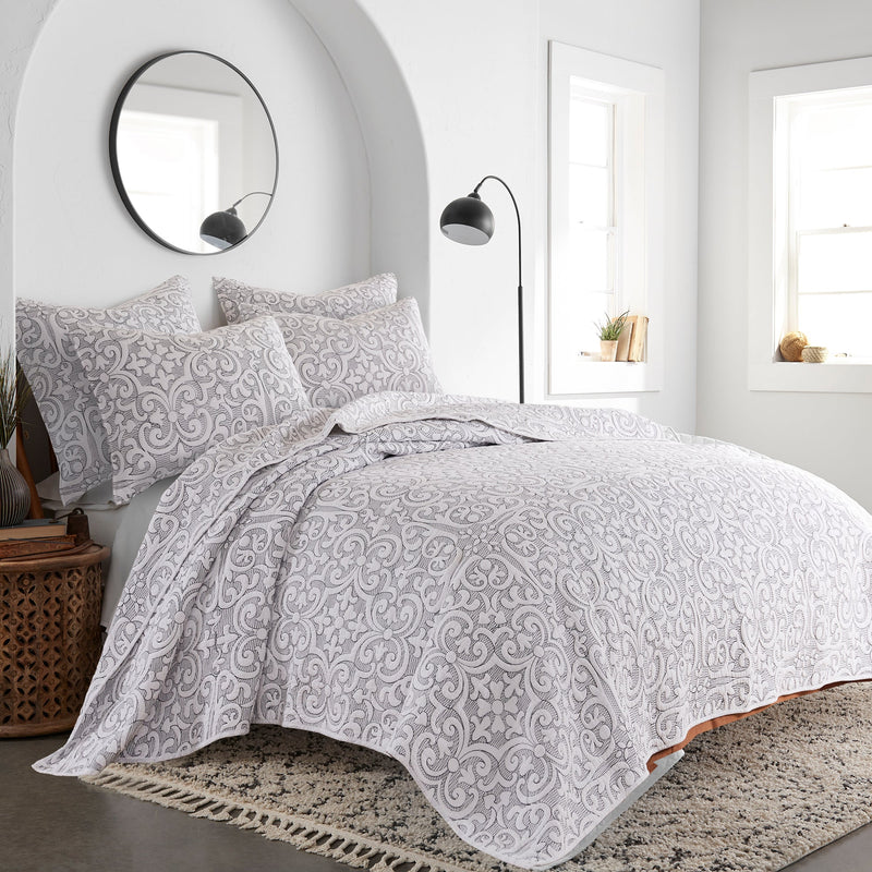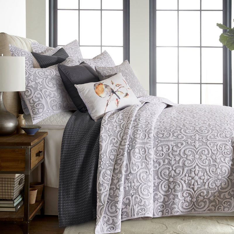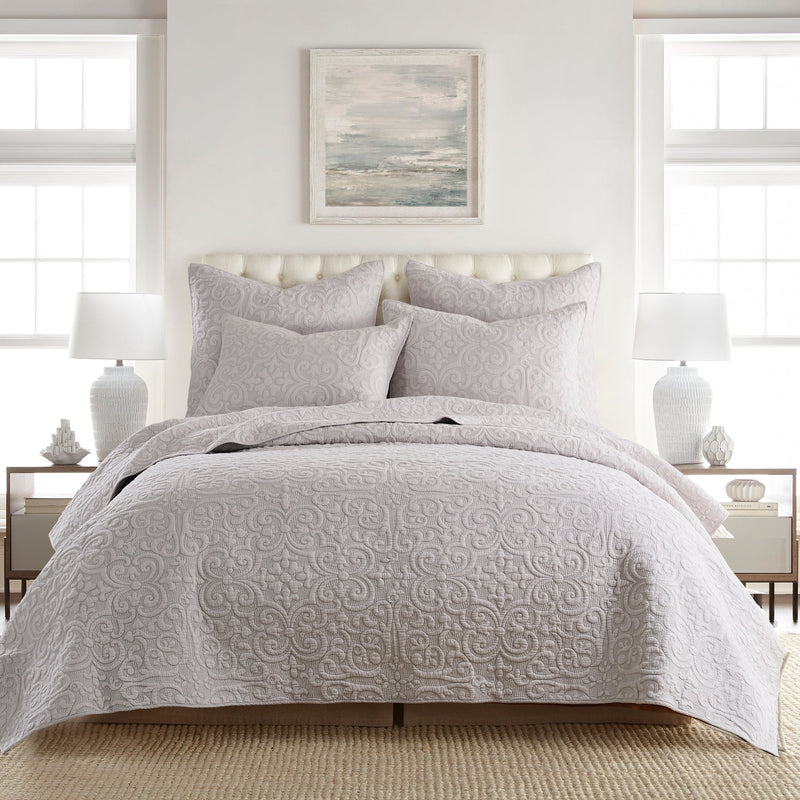 The Sherbourne Reversible Quilt by Levtex Home for Levtex Home is inspired by classic matelasse fabrics. Offered in various colors, stitch quilted design that will immediately transform your bedroom. This reversible quilt features stitch cotton quilted in an intricate medallion pattern on the front, reversing to a same as front on the back. The Quilt is cotton, filled with a cotton rich filler and is machine washable. Enjoy this for years to come!