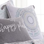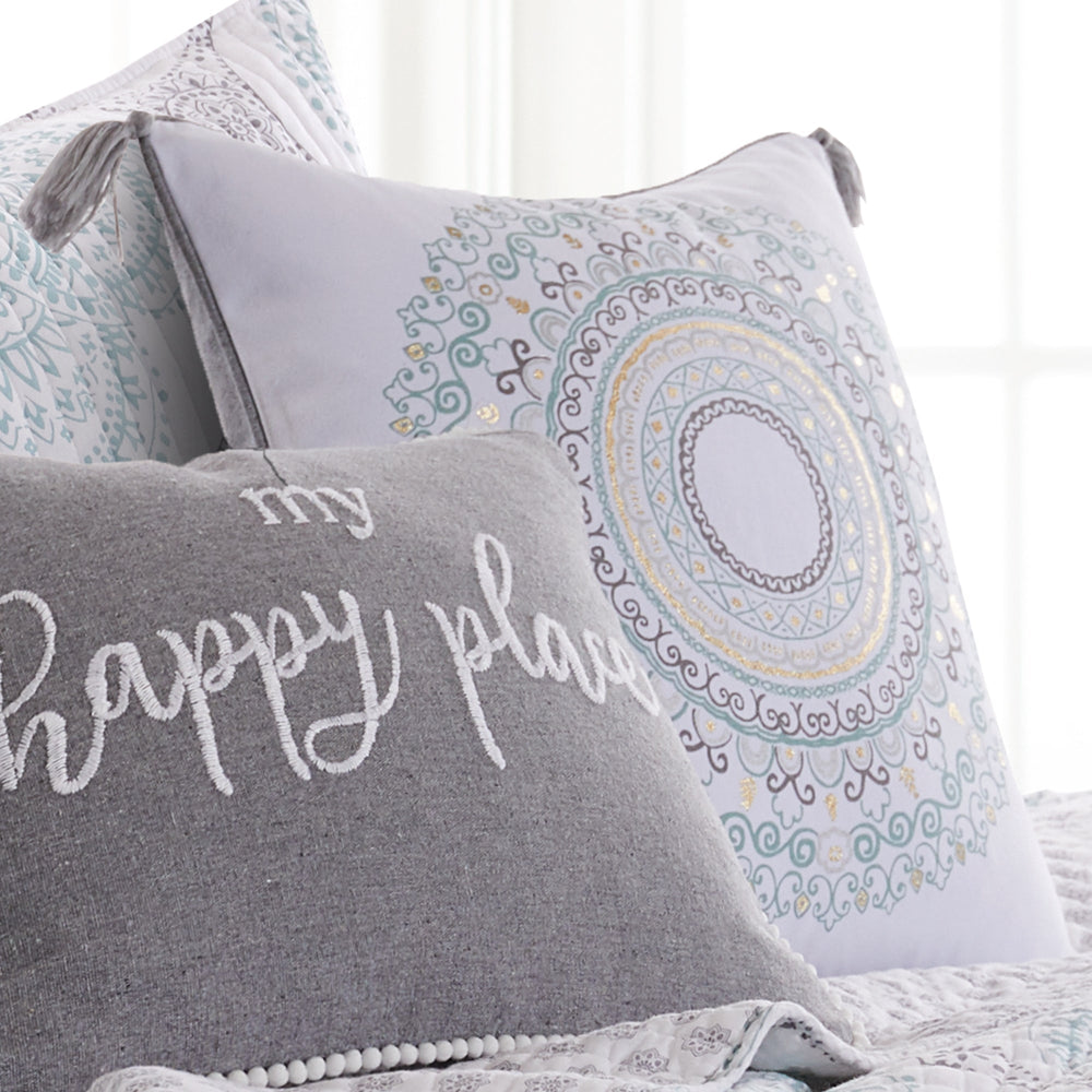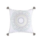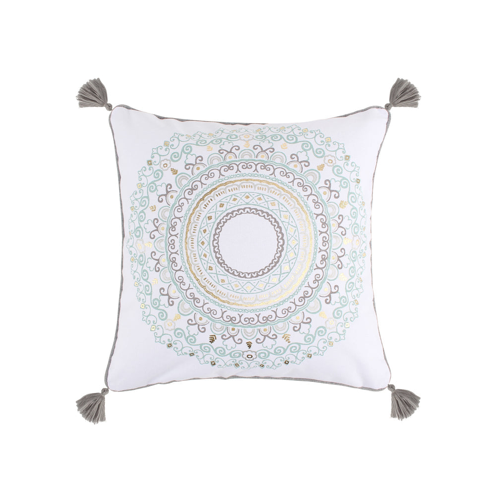 The Printed Medallion decorative pillow matches perfectly with the Levtex Home Shutters bedding collection. This pillow is sized at 18 x 18in. and features large printed medallion in grey, spand gold metallic accents on a white canvas ground with tassels. The color palette makes this a versatile accessory for your bed, couch or favorite chair. The pillow comes pre-filled with a soft. luxurious feather inner.
