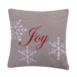 The Silent Night decorative pillow matches perfectly with the Levtex Home Silent Night bedding collection or can be used to bring the holiday spirit into any room in your home. This pillow is sized at 20x20in. and features JOY, LOVE, PEACE, BELIEVE and CHRISTMAS in silver and white, stacked like a Christmas tree with a red star on top. The pillow is finished with a red piped edge. A versatile accessory for your bed, couch or favorite chair. The pillow comes pre-filled with a soft, luxurious feather inner. Bring the holidays home!