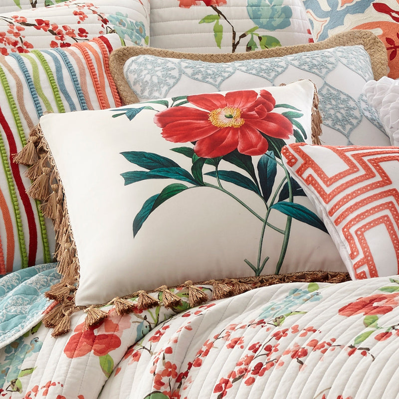 The Flower Tassel decorative pillow matches perfectly with the Levtex Home Simone bedding collection. This pillow is sized at 18 x 18in. and features a gorgeously detailed painted flower printed on a rich white ground, with shiny copper-colored knot tassels lining the edges. The red, green, copper and white color palette makes this a versatile accessory for your bed, couch or favorite chair. The pillow comes pre-filled with a soft, luxurious feather inner.