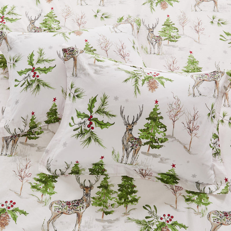 The Sleigh Bells Duvet Cover/Comforter Set by Villa Lugano for Levtex Home is a calming holiday feeling. Offered in red, green and white, this design will immediately transform your bedroom. Made with a soft and luxurious cotton, this Duvet Cover/Comforter Set features a festive, winter holiday. There are deer, Christmas trees and holly on the front and a red and white plaid on the reverse. Duvet Cover closes with easy to use, durable buttons. The Sleigh Bells Duvet Cover/Comforter Set is machine washable. Enjoy this for years to come!