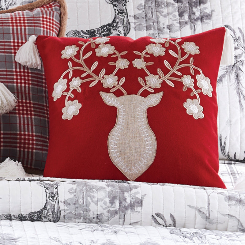 The Deer decorative pillow matches perfectly with the Levtex Home/Villa Lugano Sleigh Bells bedding collection. This pillow is sized at 18x18in. and features a stylized deer head appliqued and embroidered in tan on a rich red ground finished with white tassels in each corner. The sophisticated color palette makes this a versatile accessory for your bed, couch or favorite chair. The pillow comes pre-filled with a luxurious polyester inner.