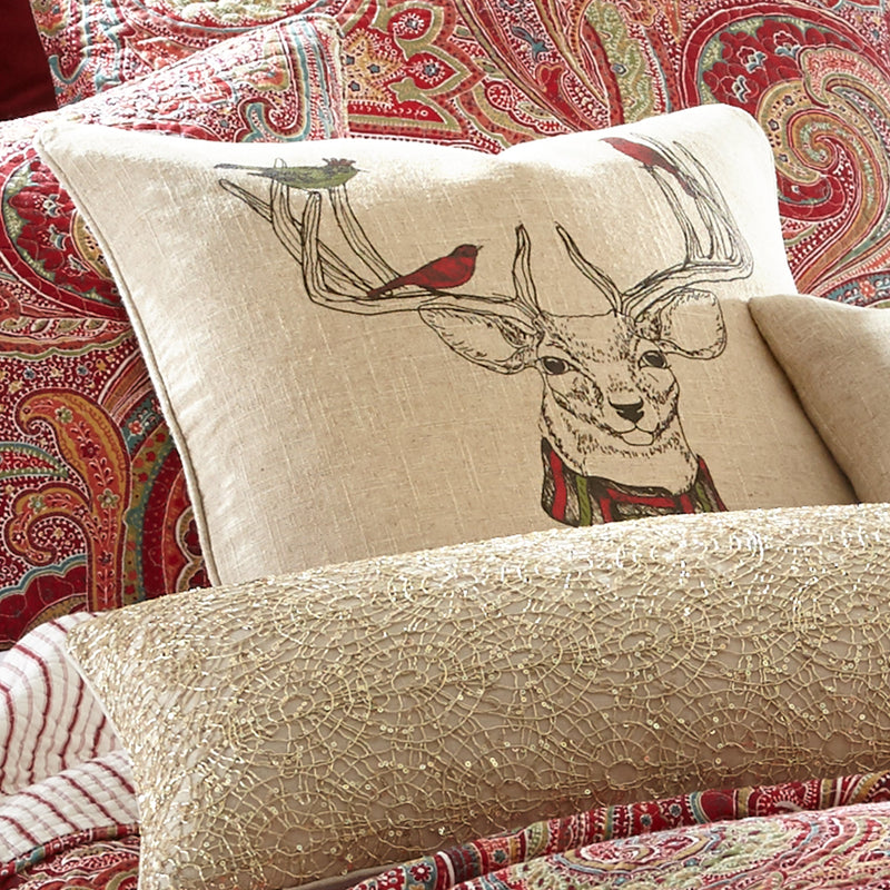 The Festive Deer decorative pillow matches perfectly with the Levtex Home Spruce Red bedding collection. This pillow is sized at 20x20in. and features a gorgeously detailed, hand-illustrated reindeer, sporting a Christmas scarf and several birds pirched on his antlers; printed on tan linen. The red, green, black, beige color palette makes this a versatile accessory for your bed, couch or favorite chair. The pillow comes pre-filled with a soft luxurious feather inner.