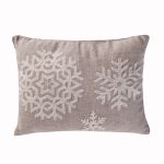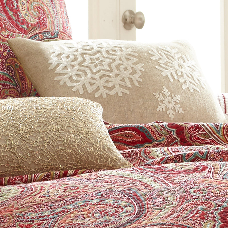 The Embroidered Snowflake decorative pillow matches perfectly with the Levtex Home Spruce Red bedding collection. This pillow is sized at 14x18in. and features three gorgeously detailed, embroidered snowflakes on a tan linen ground. The beige, and white color palette makes this a versatile accessory for your bed, couch or favorite chair. The pillow comes pre-filled with a soft luxurious feather inner.