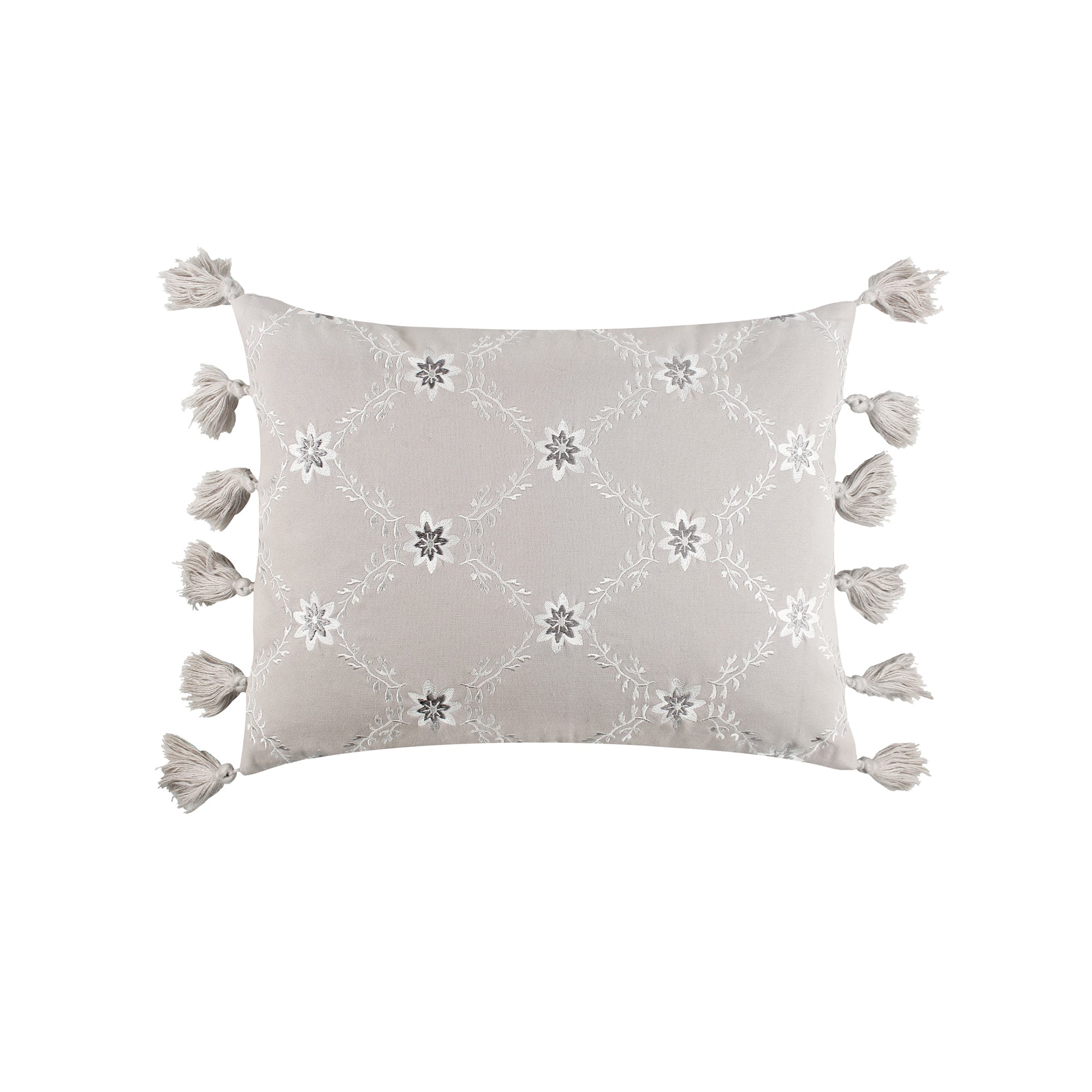 The Embroidered Flowers decorative pillow matches perfectly with the Levtex Home St. Ives bedding collection. This pillow is sized at 14x18in. and features delicately detailed flowers embroidered on a grey ground with tassels. The color palette makes this a versatile accessory for your bed, couch or favorite chair. The pillow comes pre-filled with a soft luxurious feather inner.