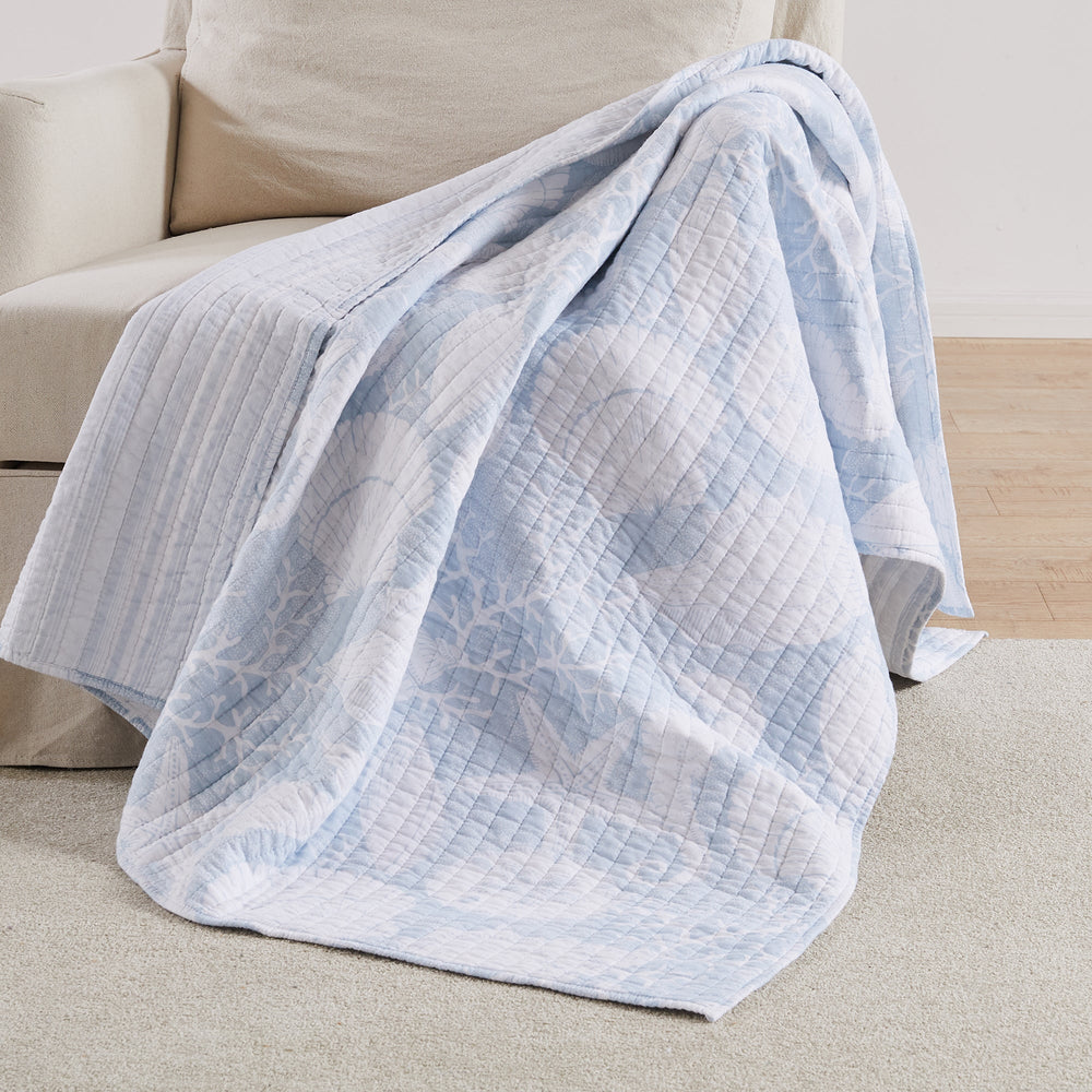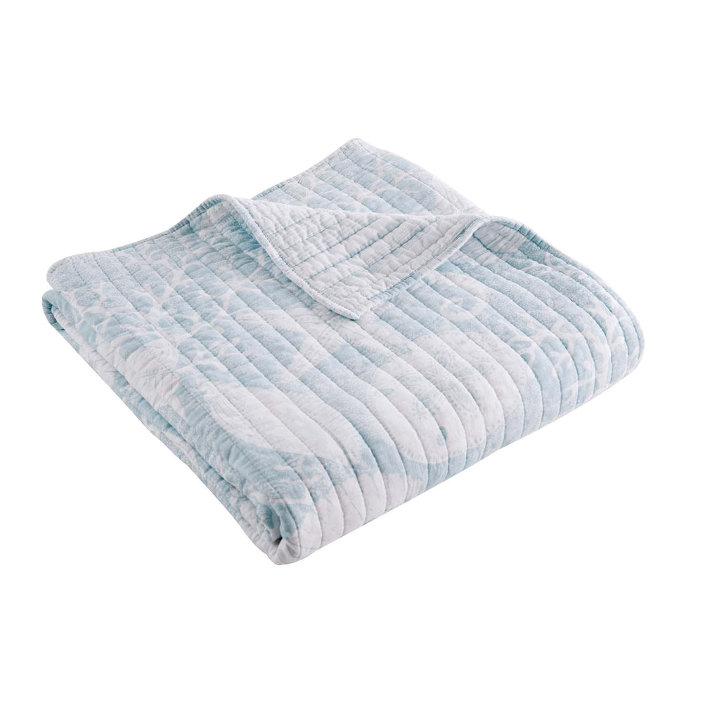 The Stillwater Reversible Quilted Throw by Levtex Home is inspired by a long walk on a sun-drenched shore. This intricate shell and coral design will immediately transform your bedroom. Made with the softest lightweight cotton, this reversible throw features shells and seahorses on a pale blue ground, reversing to color-matching stripes on the other. The Quilted Throw is perfectly sized at 50x60in., is machine washable and is filled with a cotton-rich filler (that includes cotton, polyester and other fibers). Enjoy this for years to come!