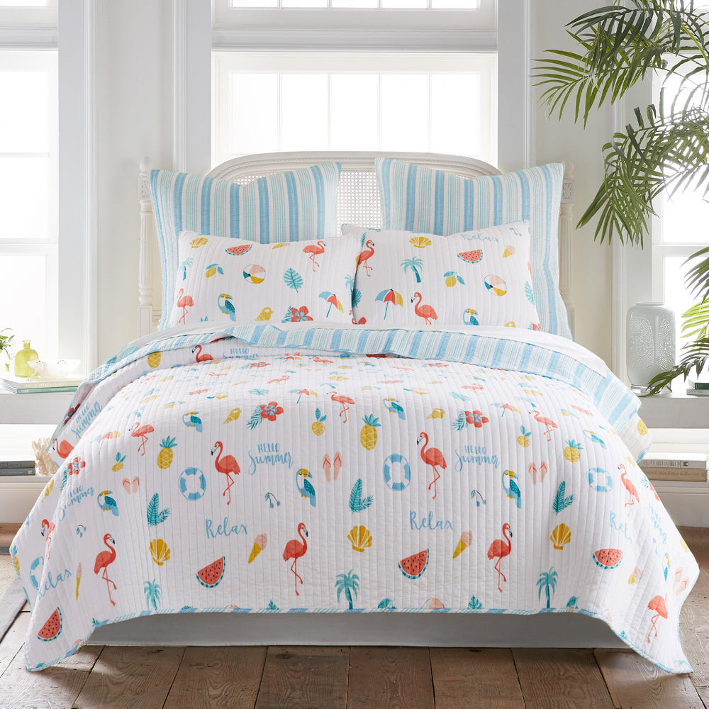 The Summertime Reversible Quilt Set by Levtex Home is inspired by a fun summer day at the beach. Offered in teal, coral, yellow, blue and white, this design will immediately transform your bedroom. This reversible quilt features whimsical beach icons on the front, reversing to a blue and teal stripe on white on the back. The Quilt Set has a cotton front and back, filled with a cotton-rich filler, is machine washable. Enjoy this for years to come!
