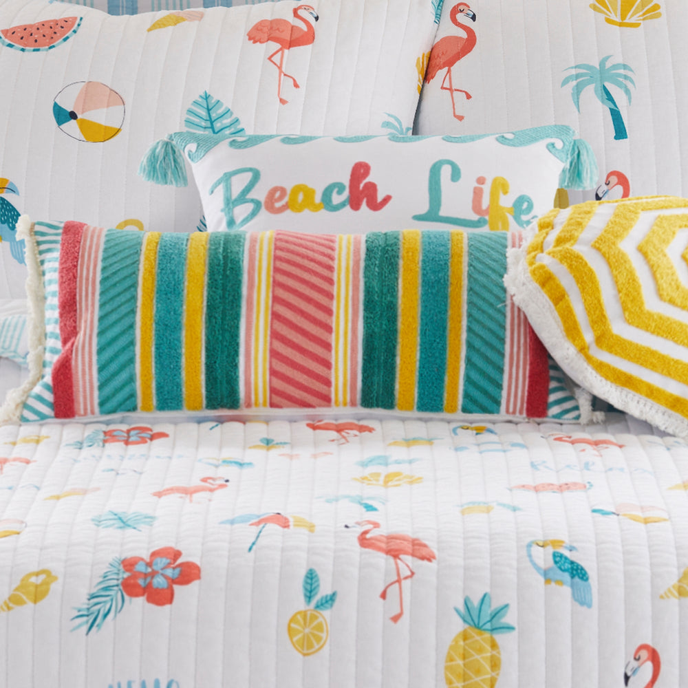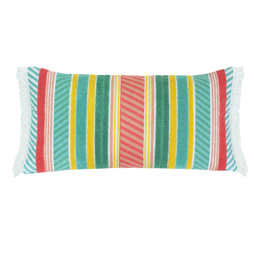 The Stripped Crewel decorative pillow matches perfectly with the Levtex Home Summertime bedding collection. This pillow is sized at 12x24in. and features intricately crewel stitched stripes on a white ground with white fringe on each side. The teal, green, coral, yellow and white color palette makes this a versatile accessory for your bed, couch or favorite chair. The pillow comes pre-filled with a soft, luxurious feather inner.